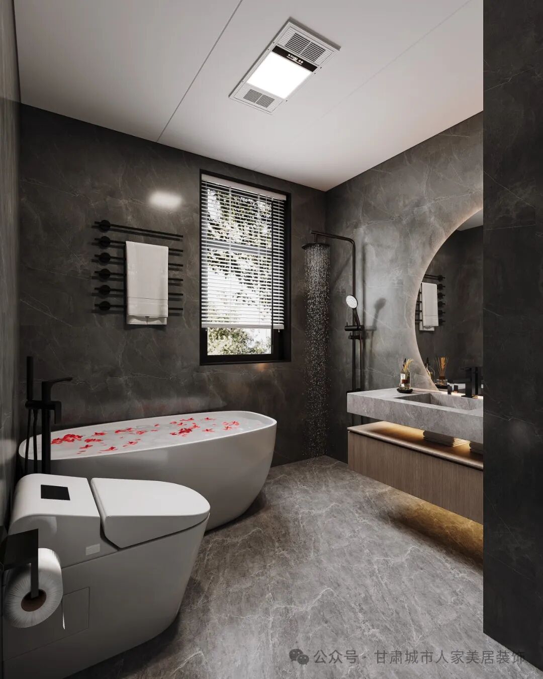 在厨房的背景墙上,设计了开放式的酒架和储物柜,既方便存放酒品和餐具,又起到了装饰作用。整个餐厨空间的设计注重实用性和美观性的结合,为业主提供了一个舒适、便捷的烹饪和用餐环境。卫生间———Toilet卫生间的设计独具特色,整体色调以深灰色为主,营造出一种沉稳而私密的氛围。墙面和地面都采用了深灰色的大理石瓷砖,搭配黑色的卫浴五金件,显得时尚而大气。卫生间内设置了一个大尺寸的浴缸,浴缸内散落着几片玫瑰花瓣,营造出一种浪漫而放松的氛围。