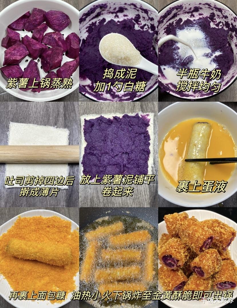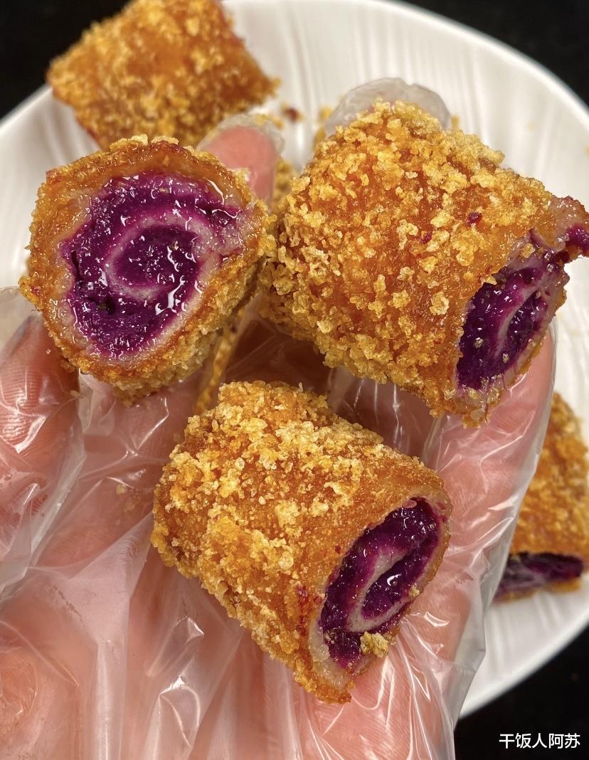 这道紫薯卷,是许多人心中“奶奶的味道”,也是如今风靡网络的“会变色的魔法面点”。它将软糯香甜的紫薯泥与松软的吐司完美结合,外层裹上金黄酥脆的面包糠,一口咬下去,先是“咔嚓”一声脆响,紧接着是温热绵密的紫薯内馅在口中化开,奶香与薯香交织,让人欲罢不能。制作过程并不复杂,只需几步,就能在家复刻这道让人“好吃到破防”的甜点。