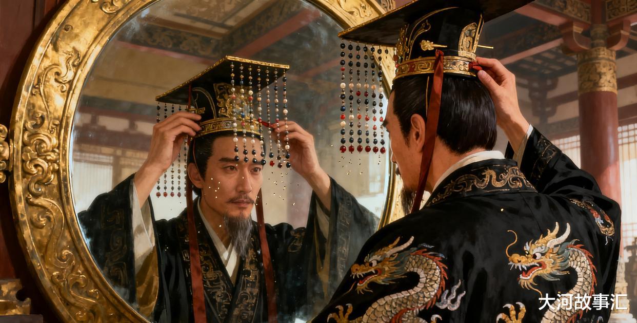 咸阳宫的鎏金铜镜前,赵高凝视着镜中身影,缓缓将十二旒冕冠戴正。