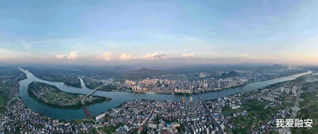 珠江上游的融江广西柳州市融安县城段,展现出迷人的秋日美景。(无人机全景照片,谭凯兴 摄)
