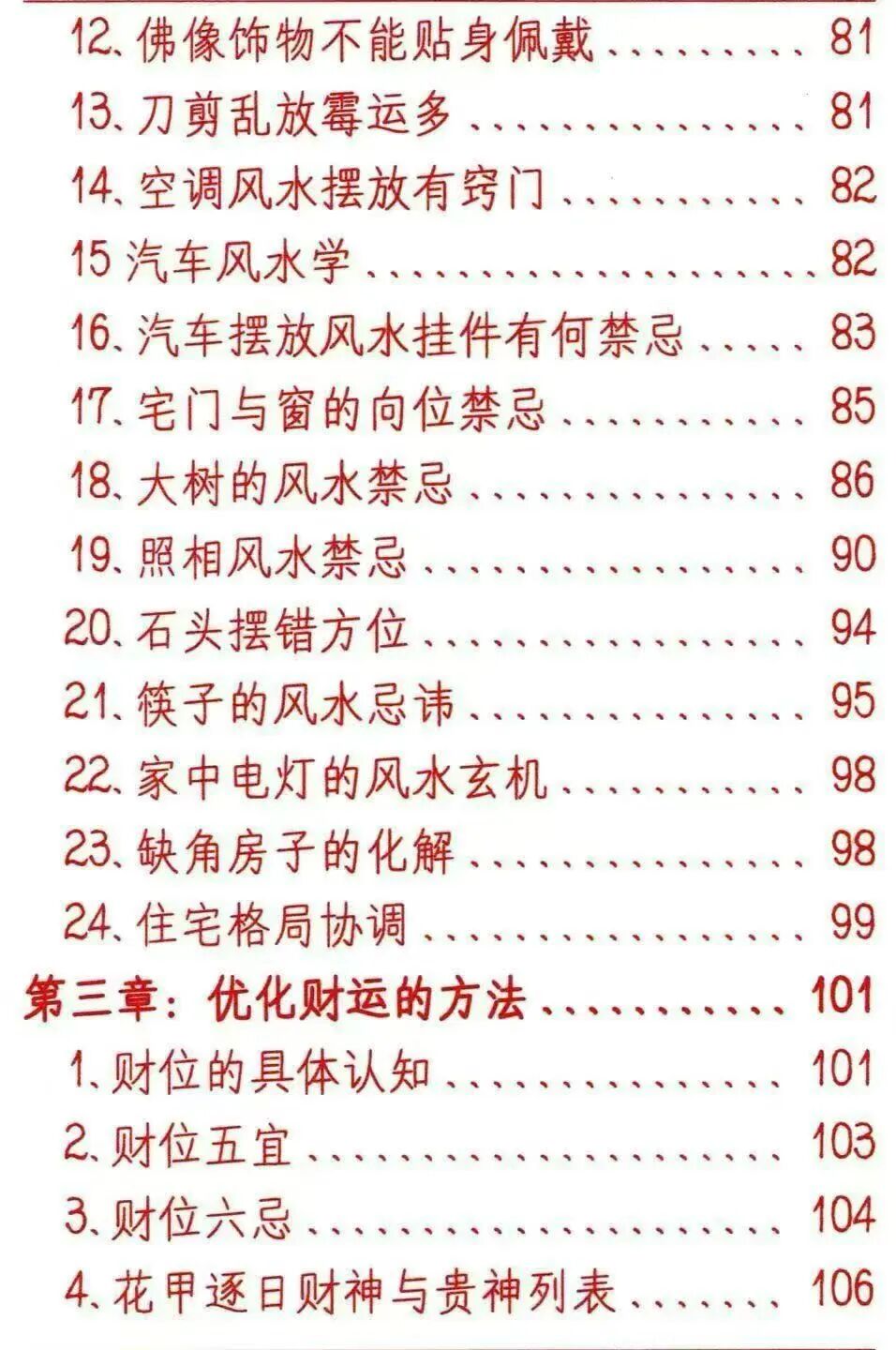 第二章详解各类日常风水讲究,渗透生活方方面面,实用性拉满。小到钱包、衣服、戒指的佩戴摆放,筷子、电灯的日常使用,大到空调、汽车、庭院种树的风水玄机,甚至化妆修饰、就餐礼仪的风水禁忌,都有详细解读,更包含缺角房子、宅门窗向位等常见问题的化解之法,让风水融入日常,举手投足间就能趋吉避凶。