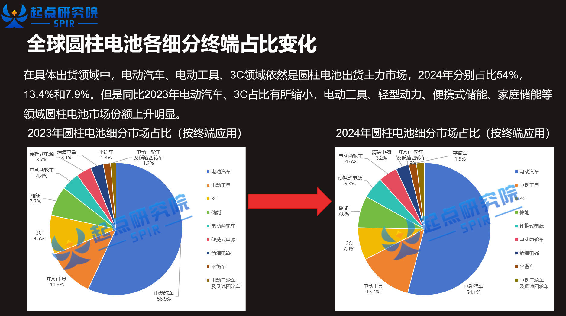 从应用领域分布来看,圆柱电池的细分应用终端,主要为电动汽车、电动两轮/三轮车、电动工具、小型储能(户用/便携式储能)以及3C设备等市场。