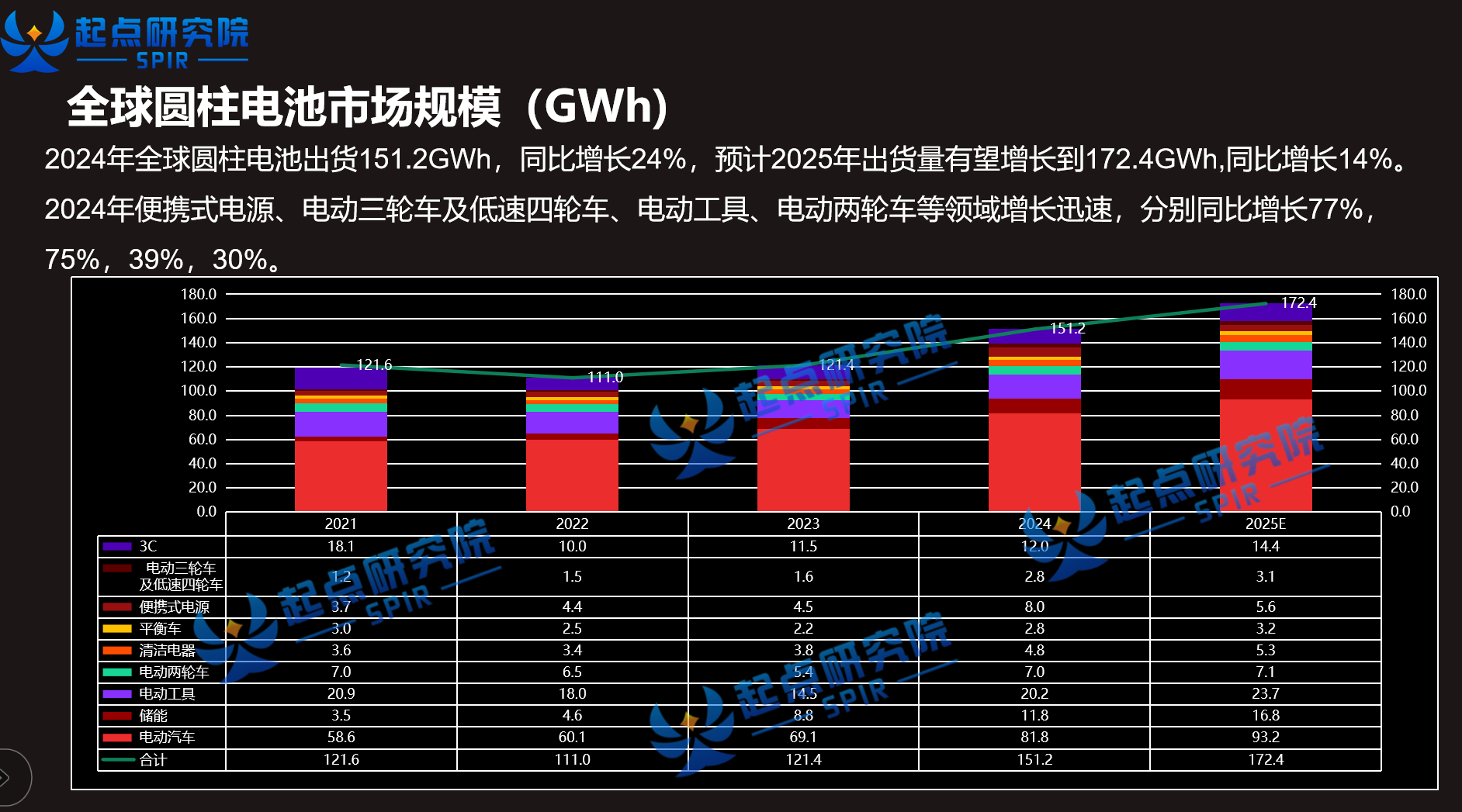 据起点研究发布的2024中国圆柱电池TOP20排行榜显示,2024年全球圆柱电池出货151.2GWh,同比增长24%;预计2025年出货量有望增长到172.4GWh,同比增长14%。