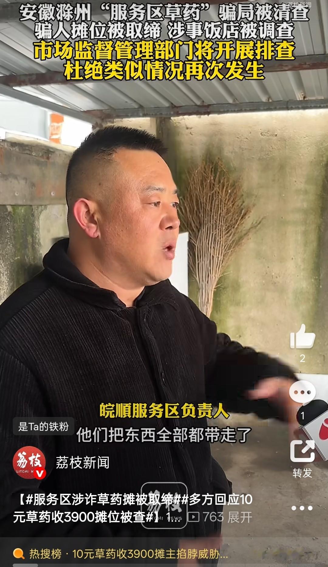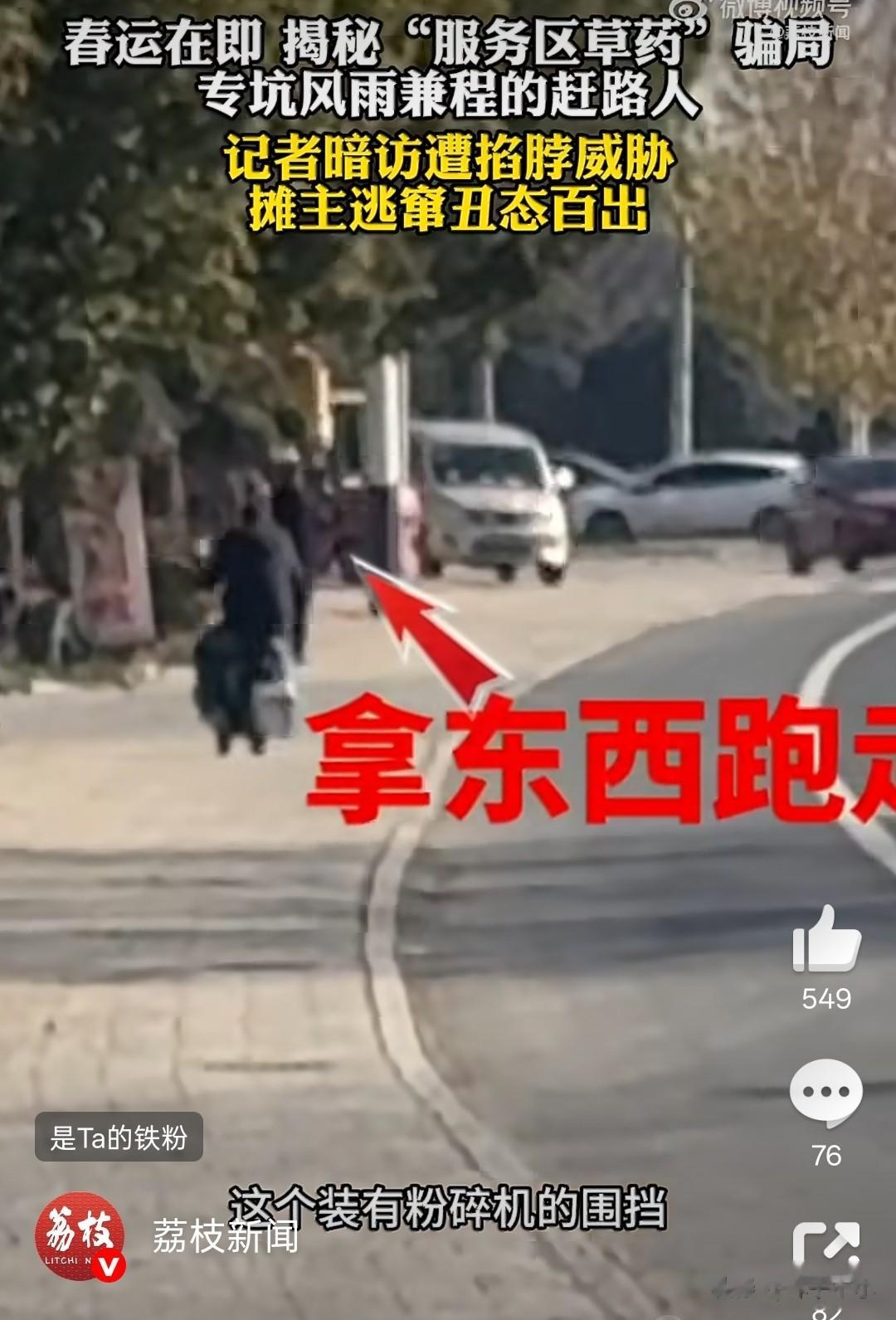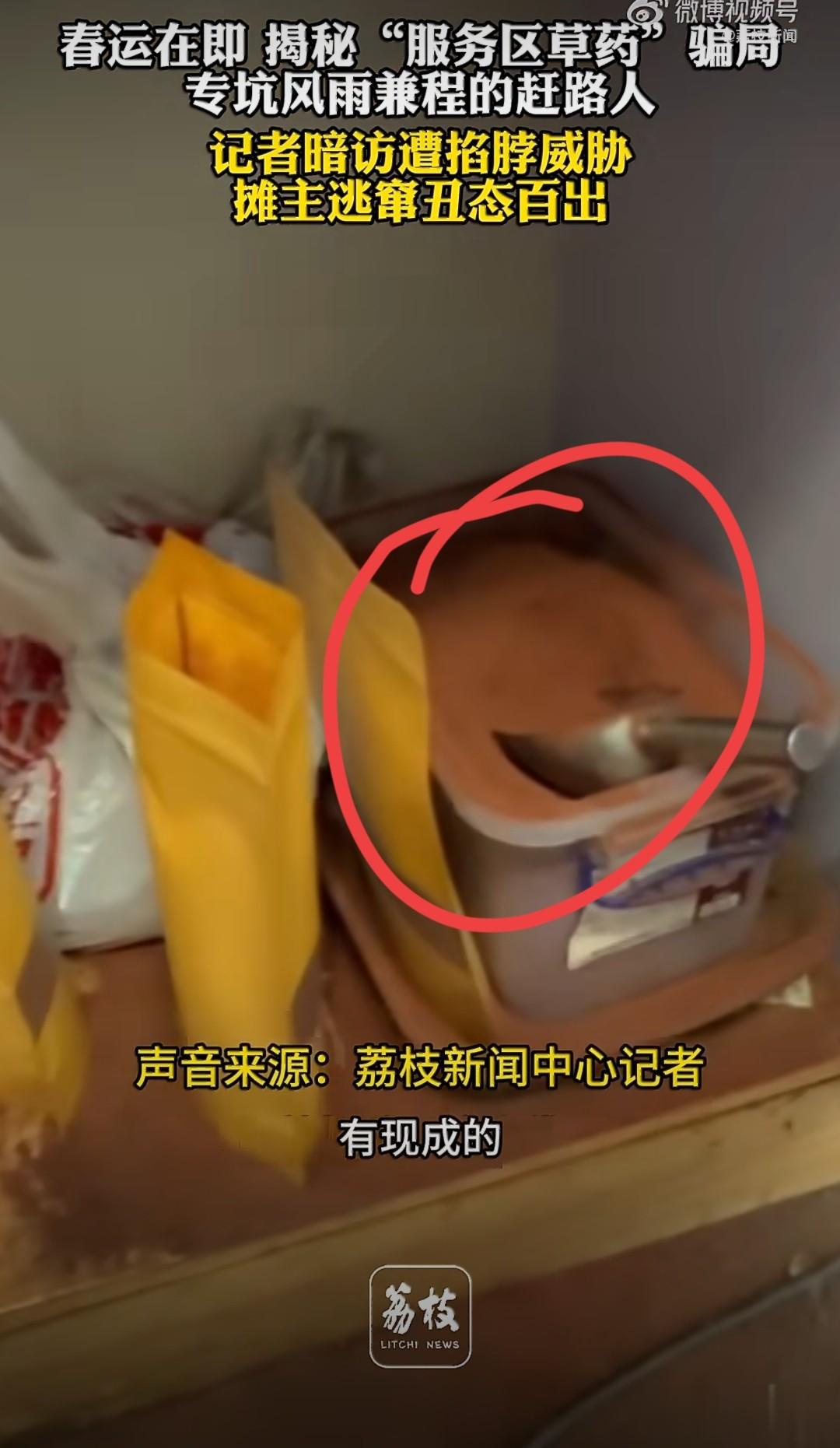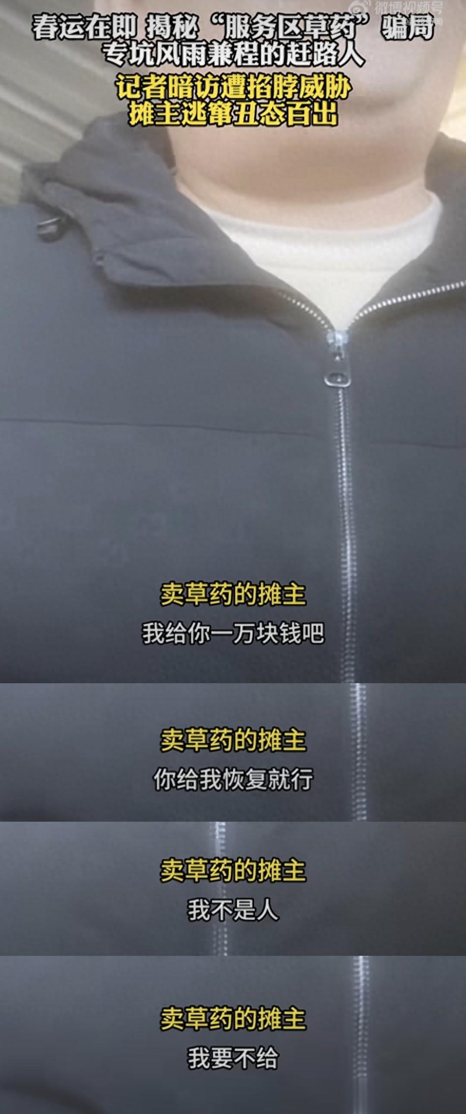 记者想要追赶,结果被服务区的老板给抱住,结果让草药摊主跑掉了。