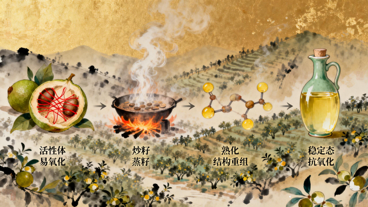 茶籽中的脂肪酶是茶油的“头号敌人”。若未灭活,它会悄无声息拆解油脂分子,使油从内部酸败。冷榨无法熄灭这些酶,因此冷榨油从诞生起就开始败坏。而热榨的高温精准灭活所有酶,让油彻底摆脱内部破坏力量——酶一旦死去,永不再复活,这是热榨茶油跨越十年的首要前提。二、热榨的魔法:从“活性体”到“稳定态”的蜕变2.1 熟化:让脂肪酸链“沉下心来”很多人误解热榨是“高温破坏”,实则是熟化的艺术。熟化不是温度过程,而是结构转化:让脂肪酸链从植物态的“紧张活性”,转为“圆润稳定”的状态,油体能量降低,不再急于参与氧化反应。就像青涩的果实成熟后更耐储存,熟化后的茶油成为“稳定体”,而非易衰败的“活性体”。2.2 多酚平衡:从“双刃剑”到“守护者”茶籽中的多酚是把双刃剑:冷榨保留的高活性多酚,虽有抗氧化潜力,却易成为氧化触发点;而热榨让多酚“归位”——从活性态转为平和态,既保留抗氧化能力,又避免成为氧化的“导火索”。这就是多酚平衡的智慧:不是越多越好,而是越稳越好。三、文明的加持:中国式储油智慧与陈化的艺术