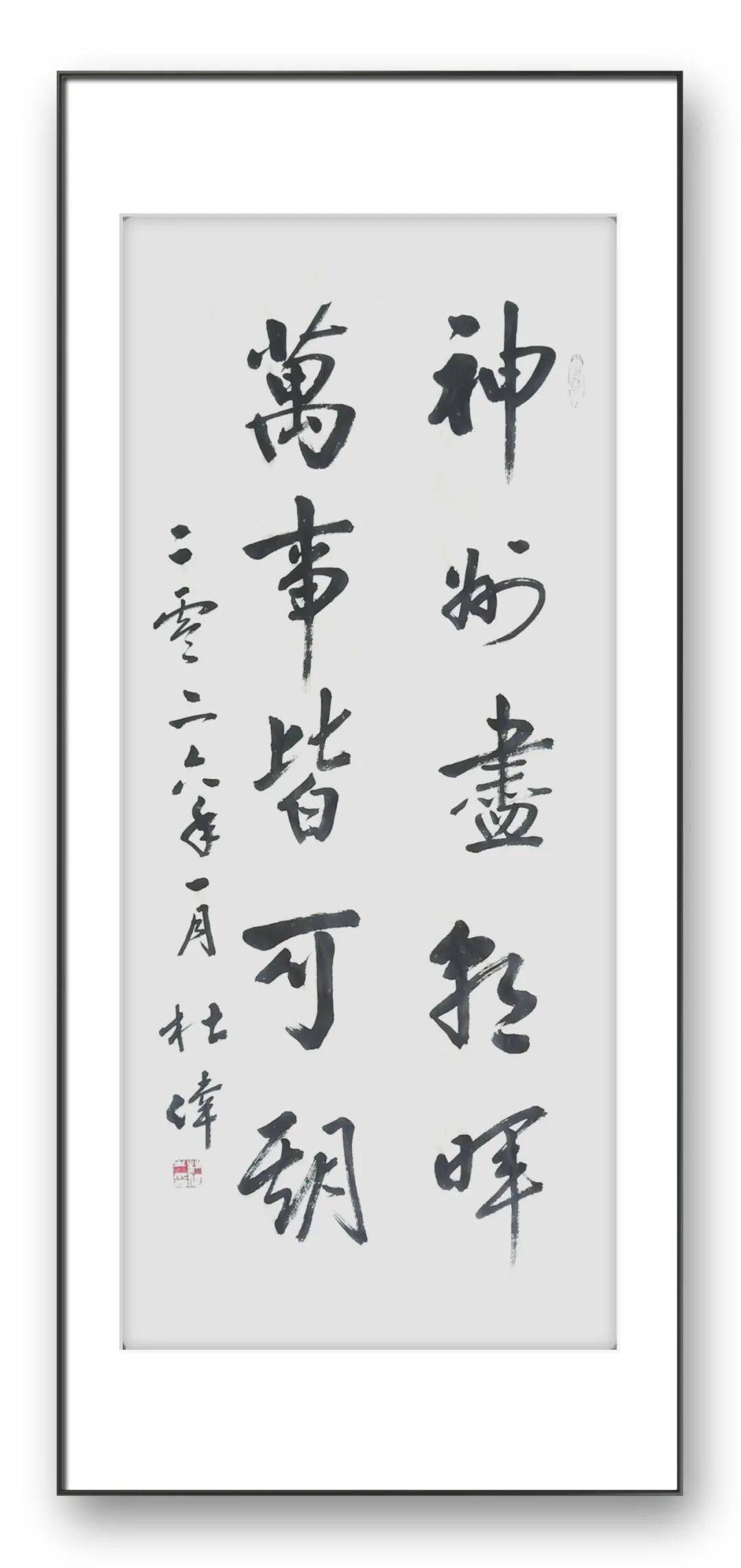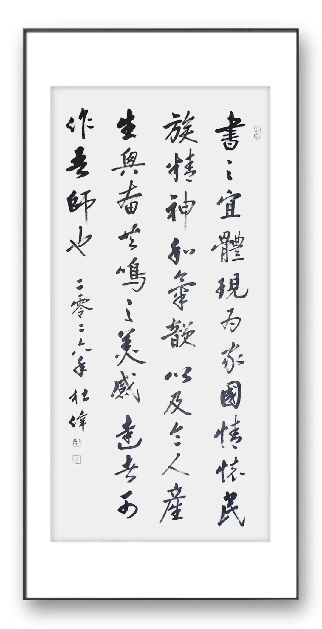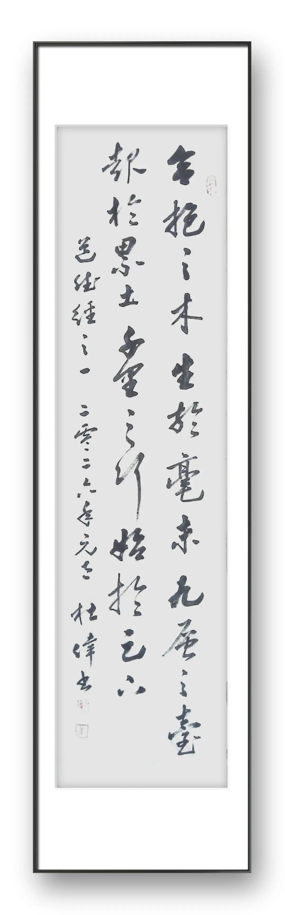 纵观杜伟老师的书法艺术之路,我们看到的是一位艺术家对热爱的坚守、对传统的敬畏、对创新的追求,更是一位文化传承者的责任与担当。四十余载临池不辍,他以笔墨为媒,传承古法精髓,抒写性灵情怀;他以初心为灯,深耕艺术沃土,铸就笔墨风华。他的书法作品,既有古典书法的雄浑雅致,又有当代审美的清新灵动;既有扎实的笔墨功底,又有深刻的文化内涵;既彰显了个人的艺术才情,又传递了中华优秀传统文化的魅力,真正实现了“五体皆能、正大气象、骨秀神清、雅俗共赏”的艺术追求。在这个快节奏的时代,杜伟老师始终保持着平和的心态,沉心于笔墨之间,不慕名利、不逐浮华,专注于书法艺术的探索与传承,这种精神难能可贵。