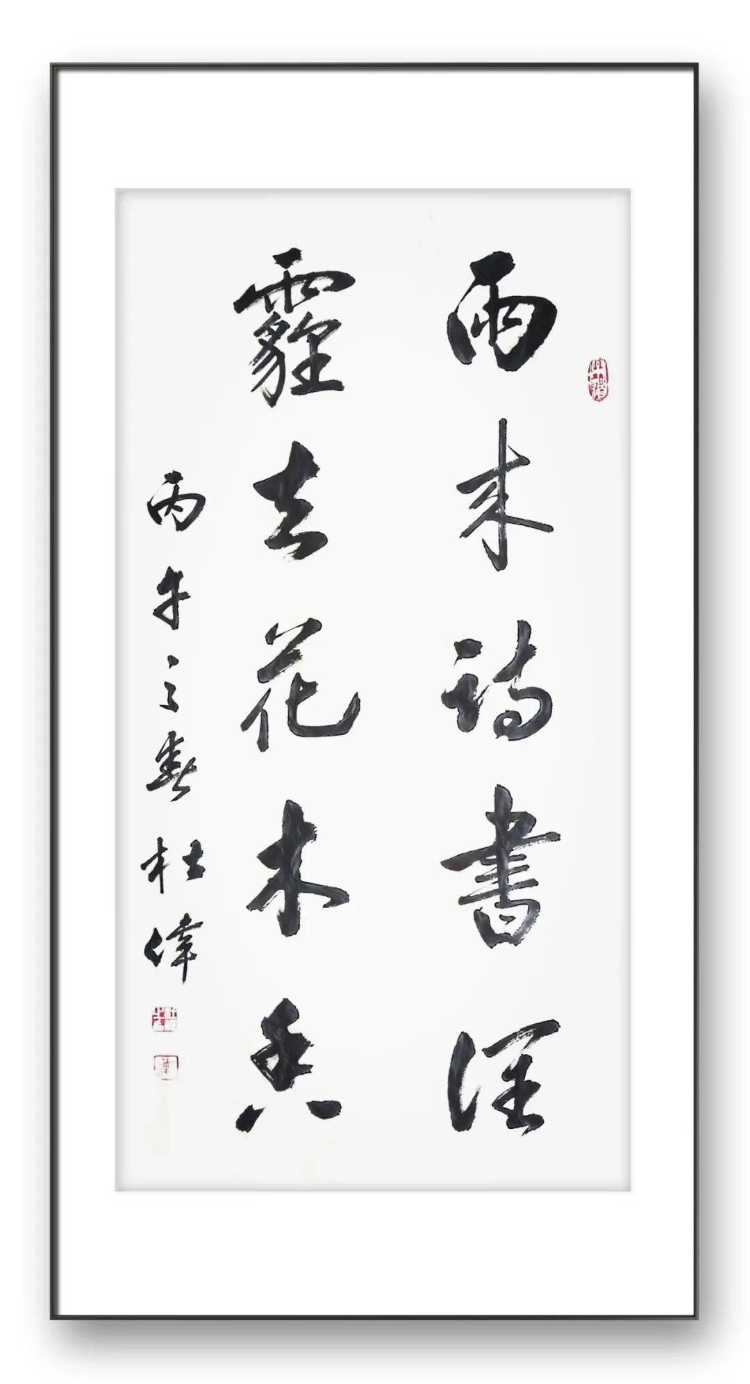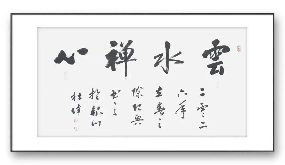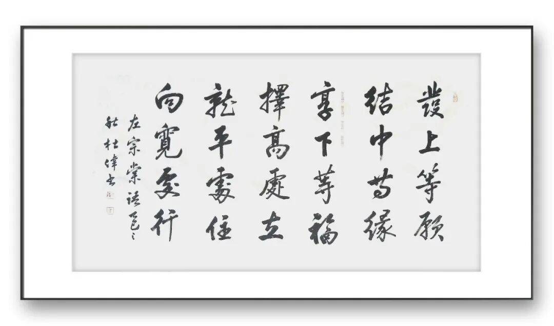 观赏杜伟老师的行书作品,笔墨酣畅淋漓,线条圆润而不软媚,劲健而不僵硬,结体欹正相生,疏密错落有致,每一笔都灵动洒脱,每一个字都富有生命力,既能让书法爱好者感受到笔墨技巧的精妙,也能让普通观者体会到书法艺术的美感,真正实现了“雅不避俗、俗不伤雅”。其行书作品不仅兼具艺术价值,更具实用价值,被广泛应用于题字、匾额、楹联等场景,深受各界人士喜爱。