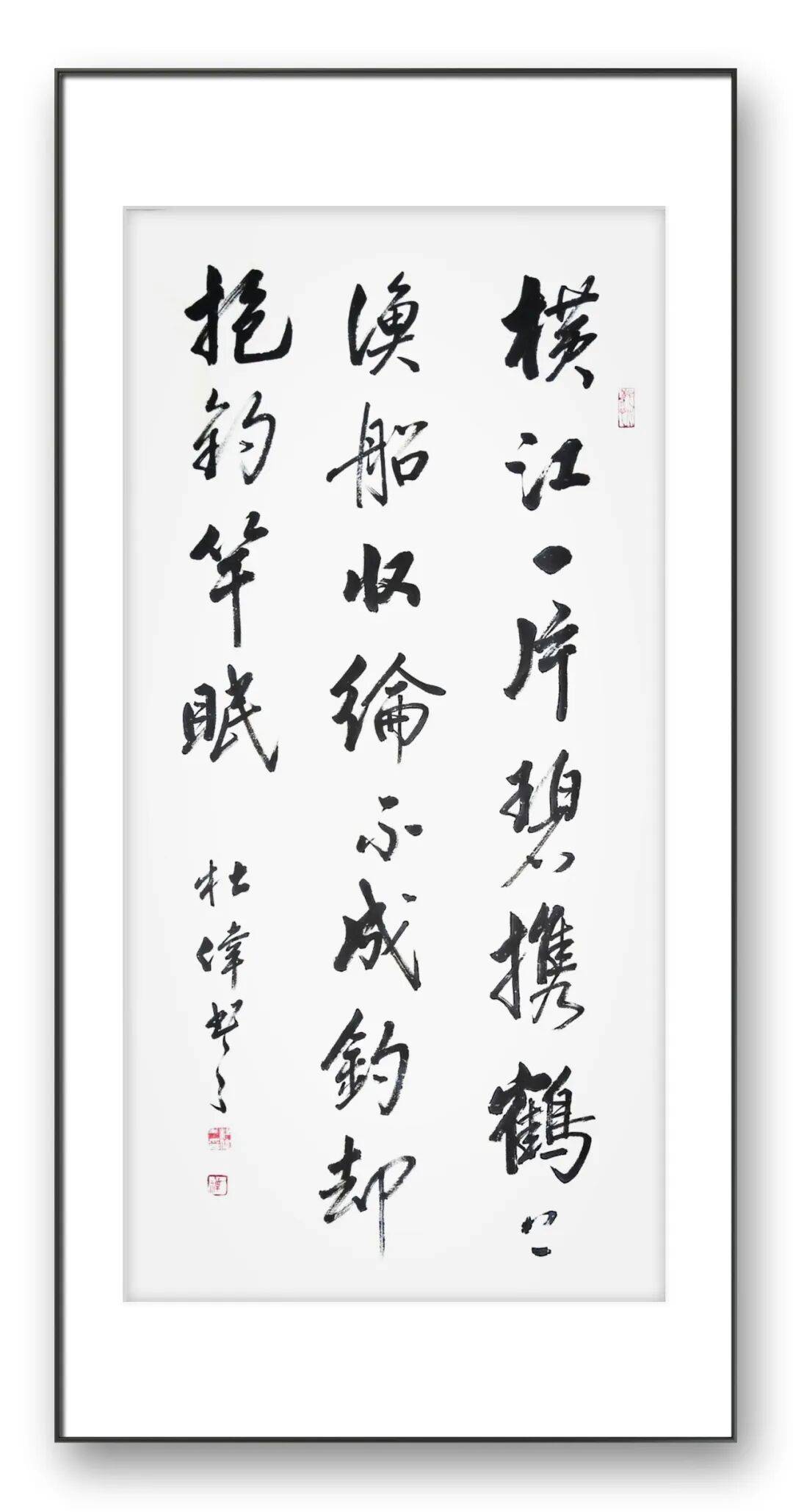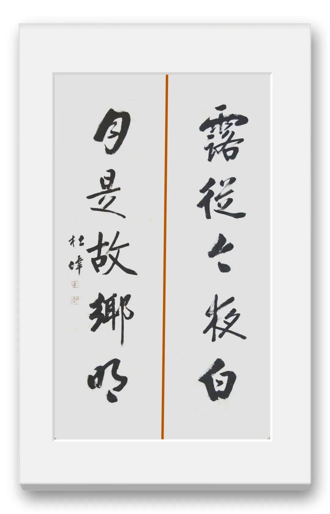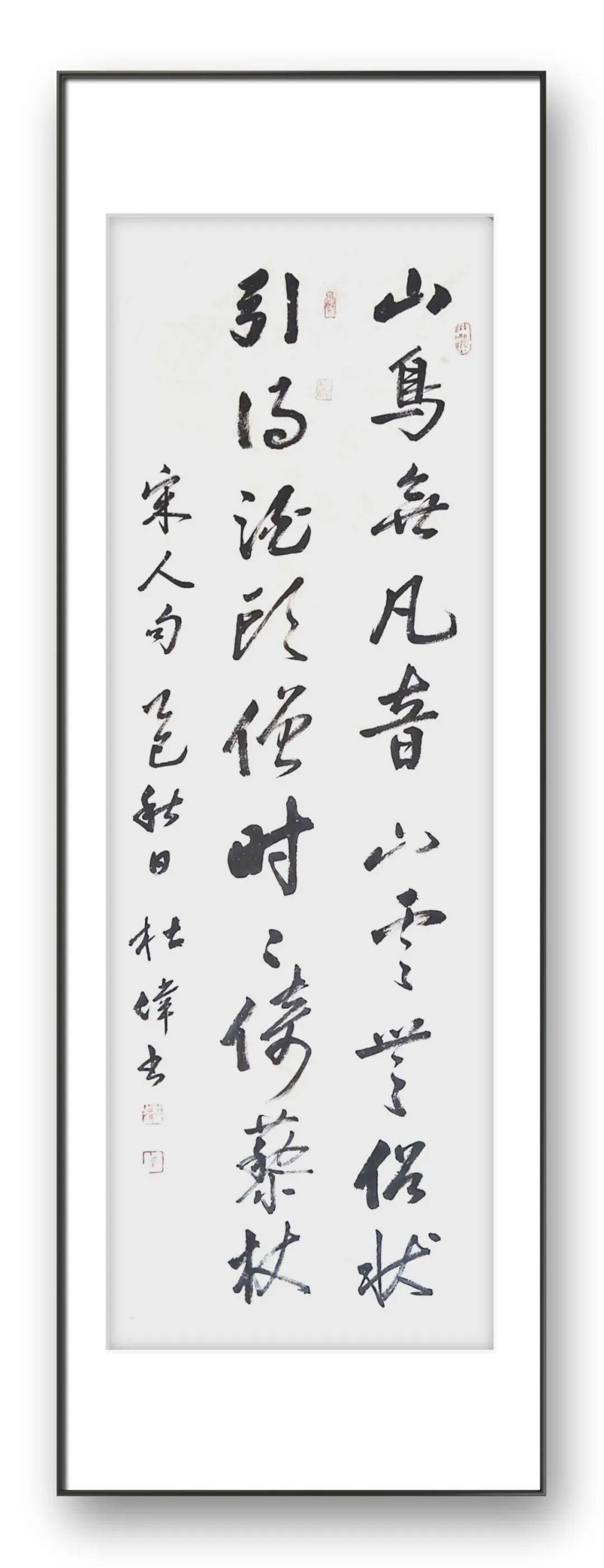 行书是杜伟老师最具代表性的书体之一,也是其性情与才情的直接流露,更是“雅俗共赏”风格的集中体现。行书介于楷草之间,兼具楷书的端庄与草书的灵动,既能体现书家的笔墨功力,又能抒发个人的情感志趣。杜伟老师的行书,取法“二王”一脉,兼融米芾的纵逸、王铎的苍劲,行笔流畅自然、气韵连贯通脱,笔墨灵动、节奏明快,于提按顿挫间将诗意的悠然与书法的洒脱相融。他善于把控行书的章法布局,疏密得当、虚实相生,字与字、行与行之间呼应连贯,整体气韵浑然一体,既没有过于潦草的肆意,也没有过于拘谨的刻板,达到了“刚柔相济、雅俗共赏”的至高境界。