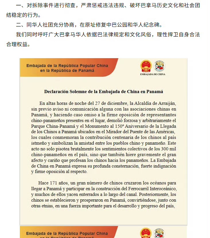 12月27日,巴拿马阿懒汉市强行拆除了位于美洲大桥观景台的、铭记华人对巴百年贡献和象征中巴人民友谊的中巴公园及华人抵巴150周年纪念碑。此举不仅粗暴践踏了巴拿马30万华侨华人同胞的集体感情。
