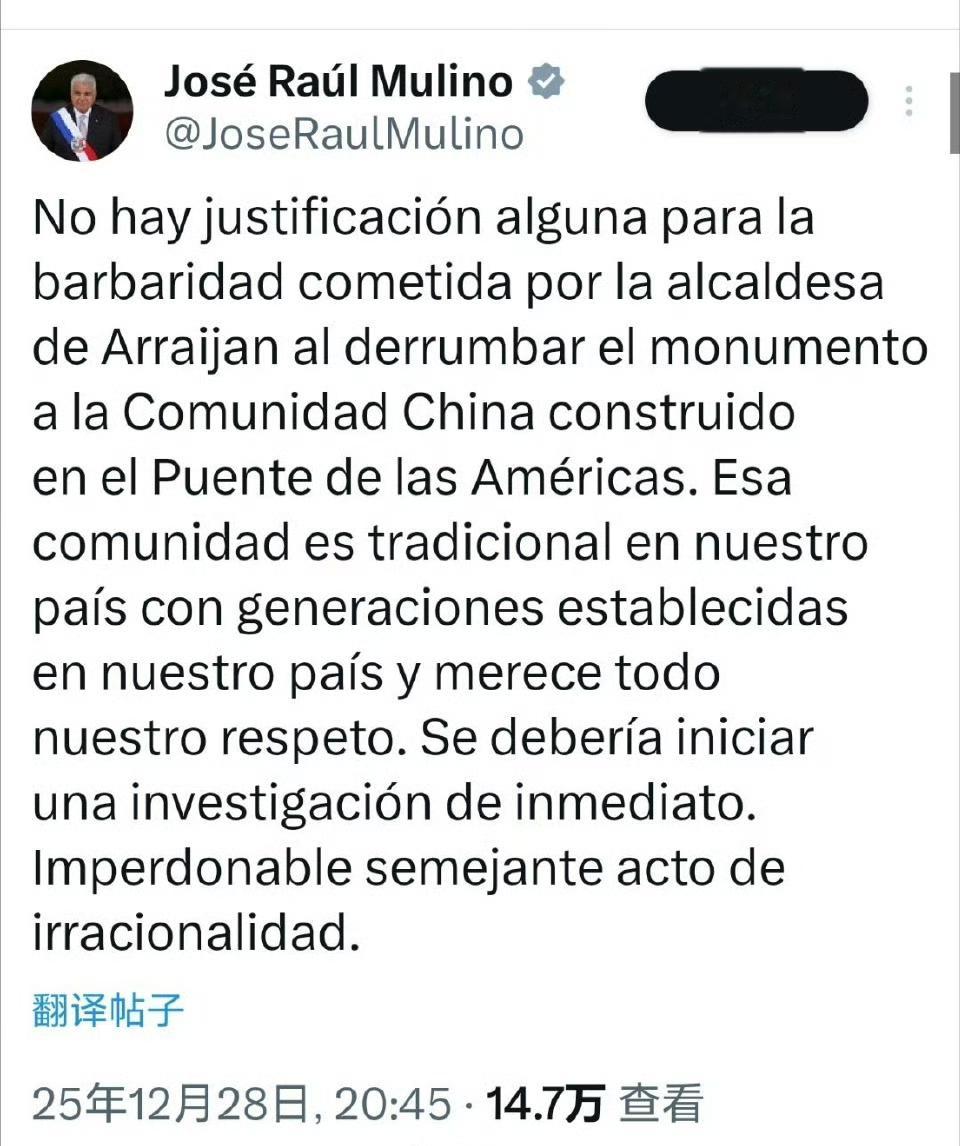 巴拿马总统也发文批评,巴拿马总统穆利诺说:“阿赖汉市市长拆毁美洲大桥上华人社区纪念碑的野蛮行径,绝对没有任何正当理由。华人社区在我国有着悠久的历史,世世代代在此生活,理应受到我们最高的尊重。必须立即展开调查。这种非理性的行为令人发指,不可饶恕”。
