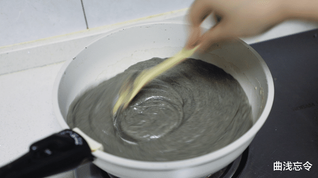 5、加黑芝麻酱:后期熬制要随时观察颜色和测量温度,温度在130℃左右加入黑芝麻酱,边加边不停搅拌。