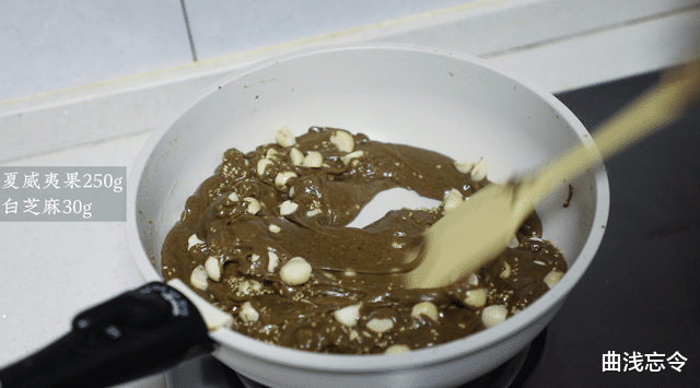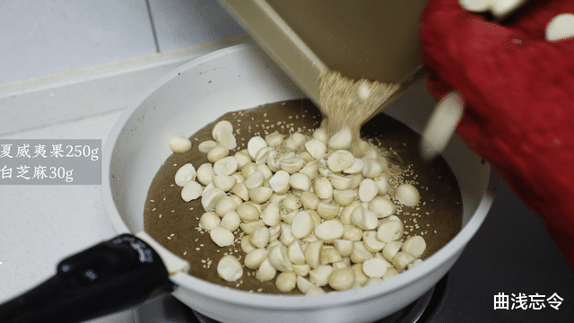 6、加坚果:155℃左右马上关火,快速倒入温热的夏威夷果和白芝麻,翻拌均匀。(如无温度计,熬汤后期可随时滴一点糖液在冷水中,冷却后掰断或咬断是酥脆即可。)