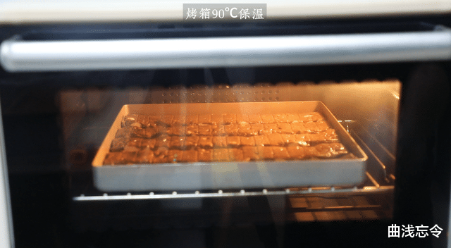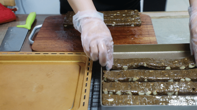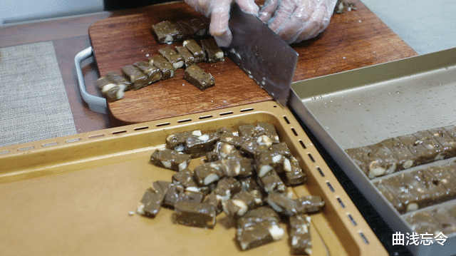 7.糖有点烫手就可以切,约80度左右,温度太低切容易碎渣,如过凉就放烤箱90℃回温烤一会。