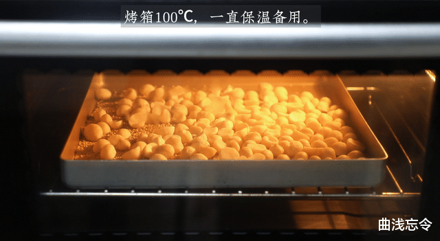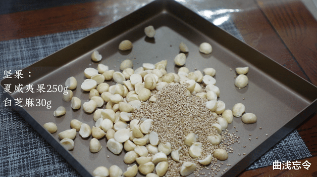 2、烤坚果:将夏威夷果和白芝麻倒入烤盘,送入烤箱100℃保温备用。同时把待会要用的不粘垫、压平器也放入烤箱内或烤箱顶保持同样温度,确保太妃糖整型时所接触的食材和器具(坚果、烤盘、不粘垫、压平器)都在温热状态,避免因太多温差导致出油的可能。