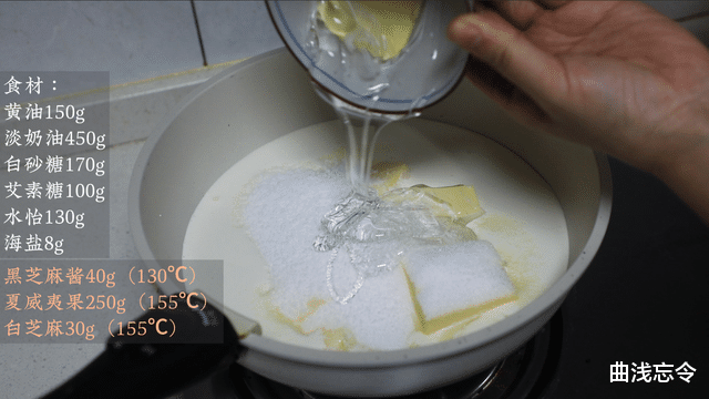 食材:熟夏威夷果250g、淡奶油450g、白砂糖170g、水怡130g、艾素糖100g、海盐8g、黄油150g、白芝麻30g、黑芝麻酱40g