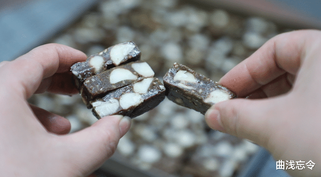 配方中的芝麻用到了白芝麻颗粒和黑芝麻酱。两者各司其职,黑芝麻酱融入糖液,形成别具一格的黑色糖液主体。白芝麻与夏威夷果作为白色的点缀。就有了这款黑白分明的太妃糖。