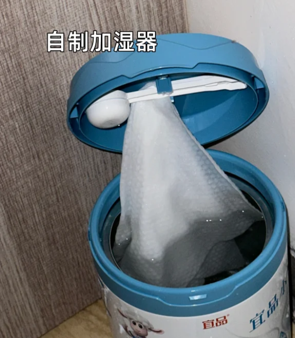 在奶粉罐里面装上水,在固定一块洗脸巾,小型加湿器就做好了。