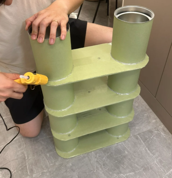 先把硬质壳粘贴成楼梯的形状,在跟奶粉罐组装在一起。