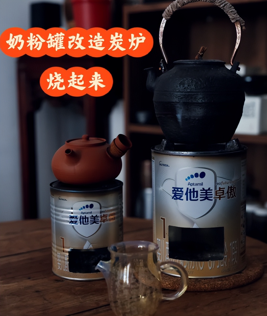 奶粉罐开口后,上面可以放碳块,点燃后,上面放茶壶,用来烧水效果刚刚好,根本不用花钱买碳炉了,而且还挺有艺术感的。