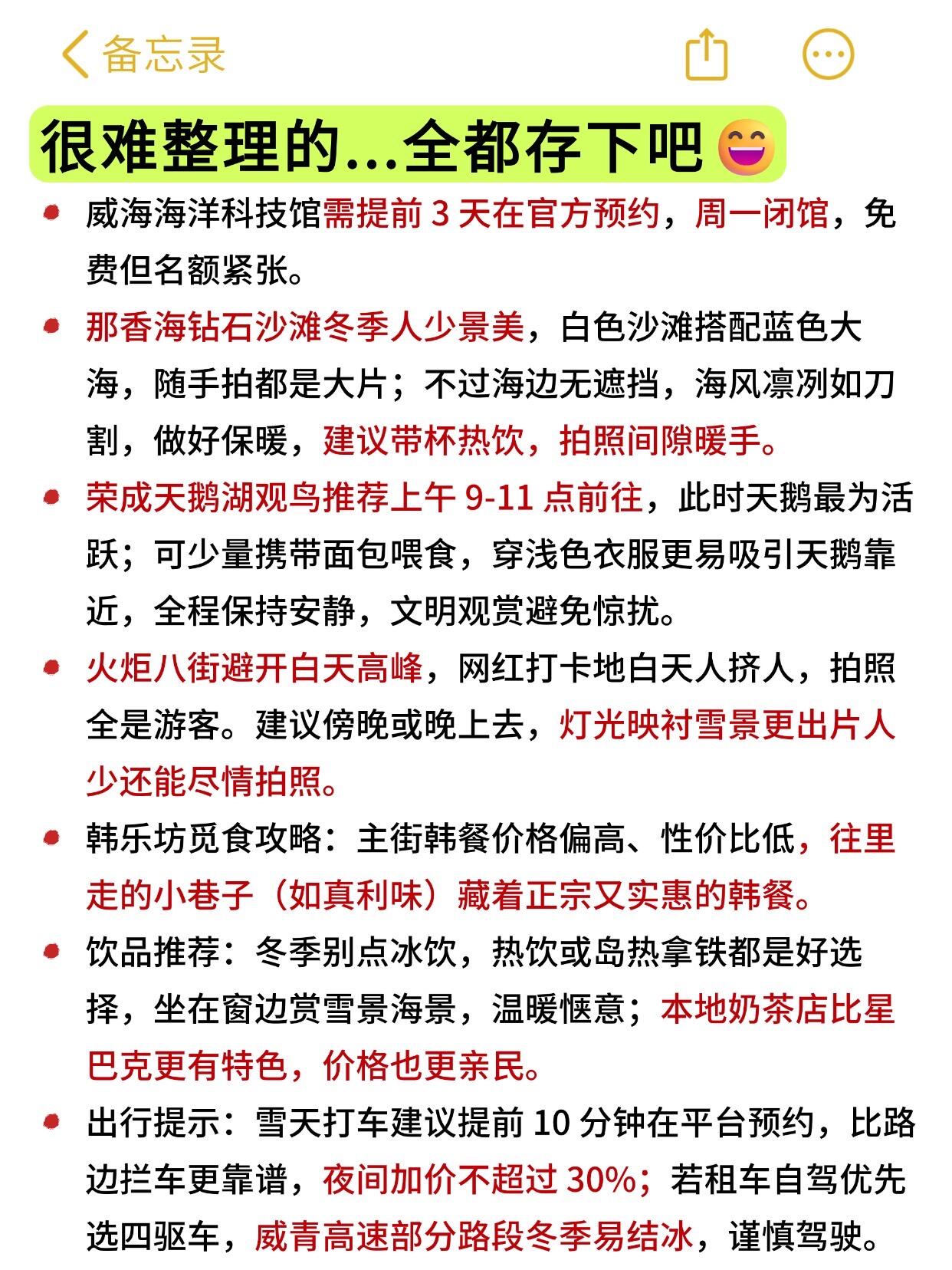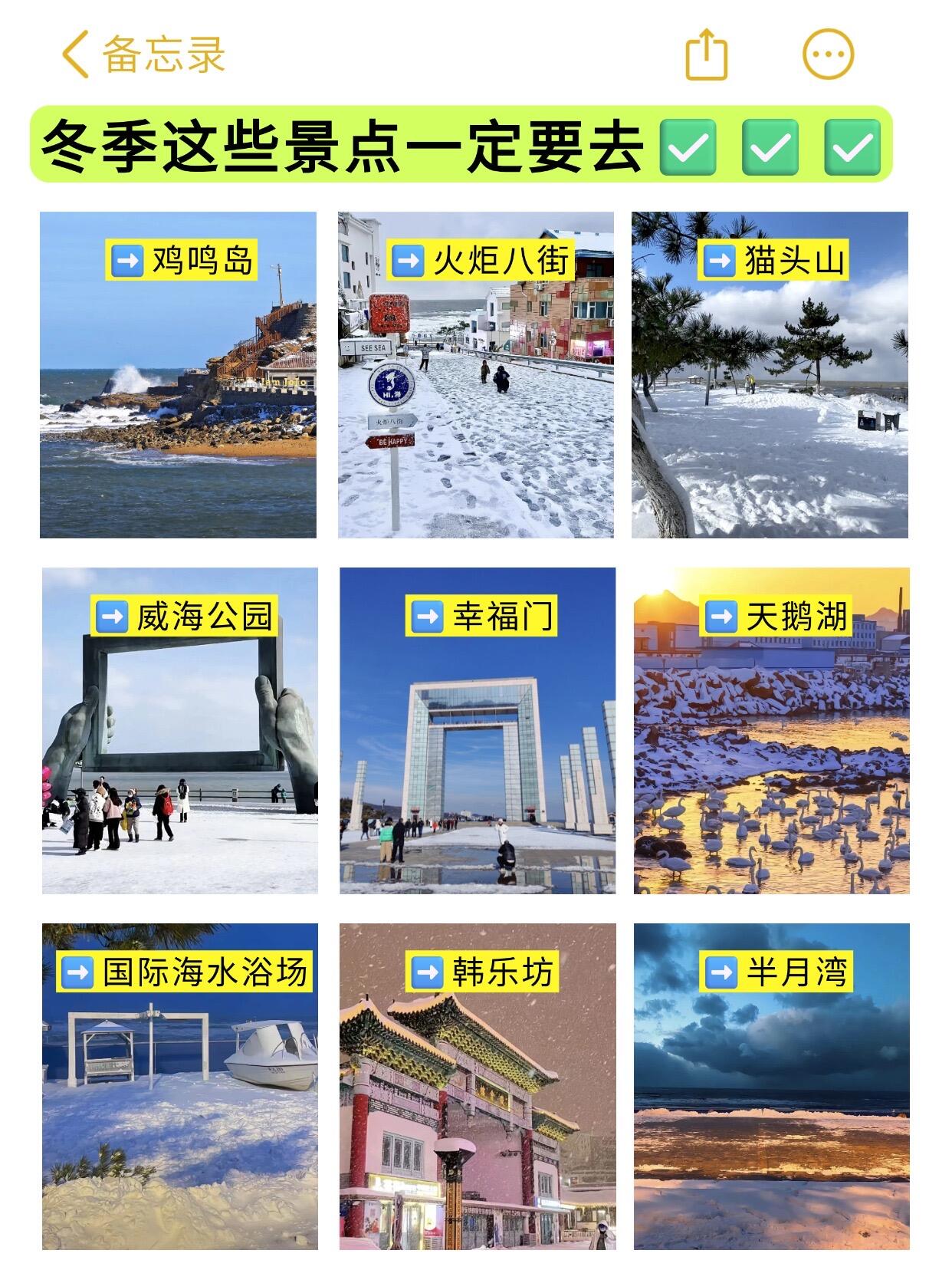 鸡鸣岛看海浪拍石头、猫头山3号观景台能拍到像项链一样的海岸线、天鹅湖上午去可以喂大鹅、威海公园那个相框配上雪和海,好看得想一直待着。📸✨
