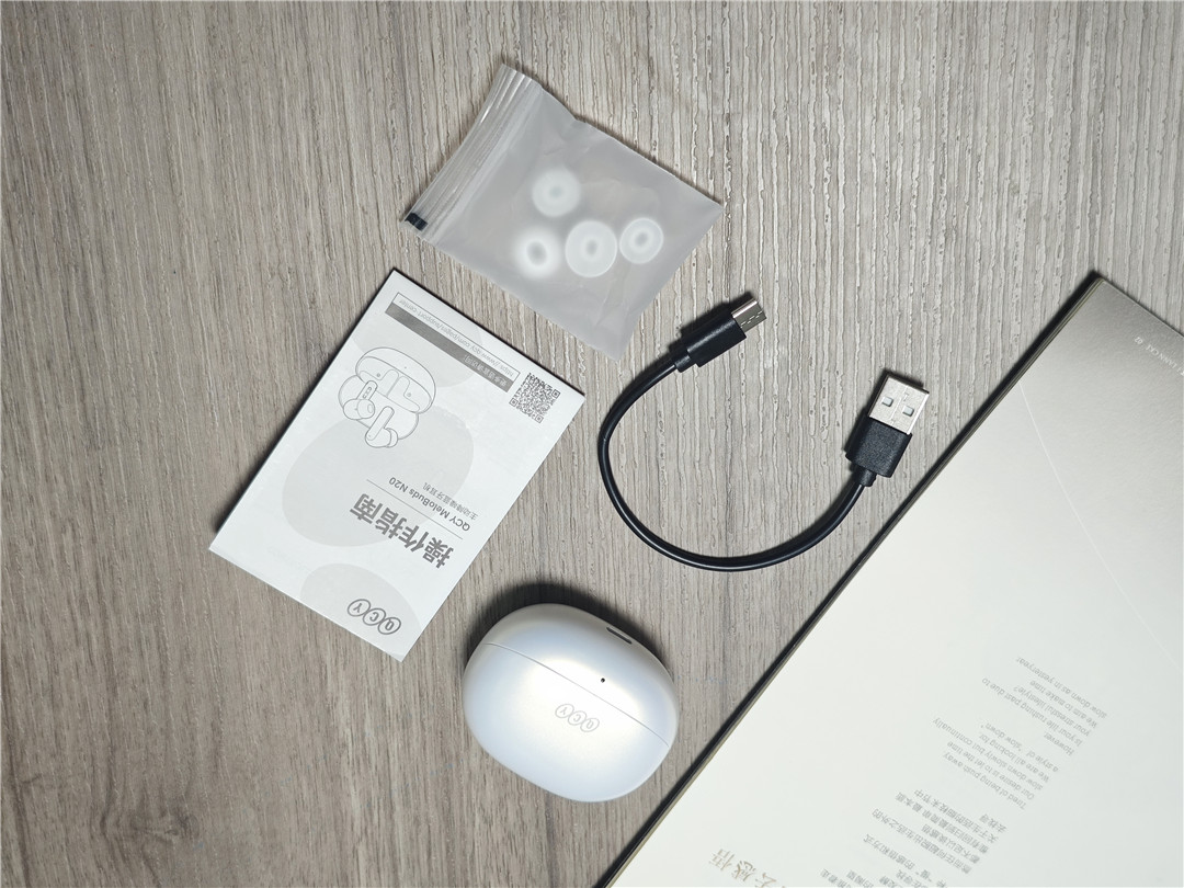 拆开外包装,内部布局规整有序。充电仓被固定在定制的凹槽中,有效避免运输过程中的磕碰。配件方面,除了 QCY N20 耳机本体和充电仓,还附带了一根 Type-C 充电线、两对不同尺寸的硅胶耳帽以及一份产品说明书。