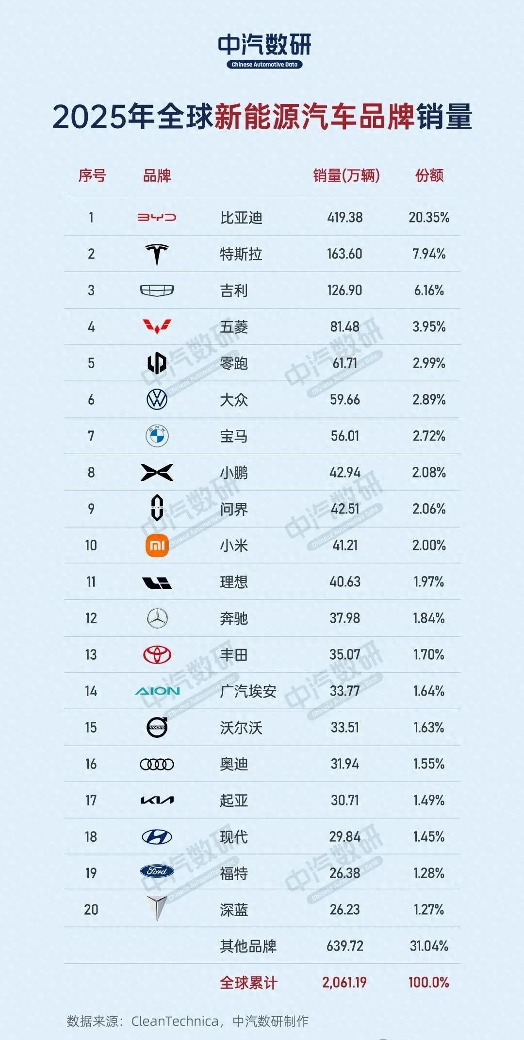 第三方行业机构最新发布2025全球新能源汽车品牌销量TOP20榜单,看完真的忍不住感慨:中国汽车真的站起来了。