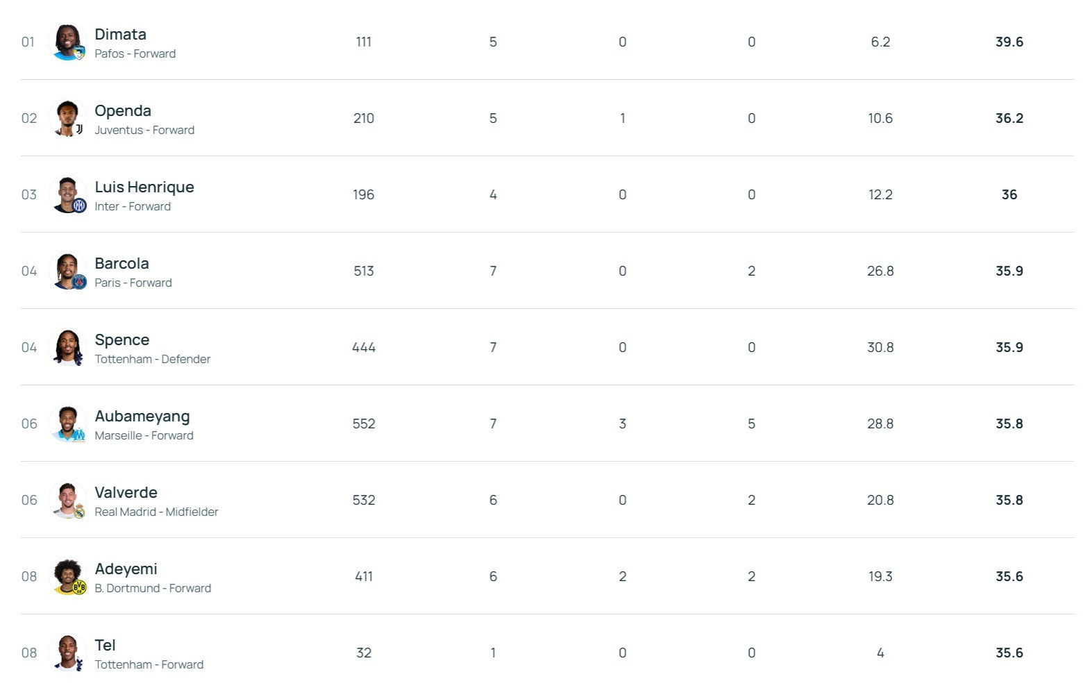 也许是迪马塔心态出了问题,因此他才在塞浦路斯球队帕福斯表现不佳。实际上他还是欧冠联赛现役球员中速度最快的人。今年1月23日,欧足联官网公布了统计数据,帕福斯前锋迪马塔以39.6km/h的速度领强势领跑欧冠冲刺速度榜。当时第2名的速度为36.2km/h,他的速度比第2名高出了一大截,他的速度在欧冠现役球员中是最快的。速度是迪马塔的一大优势。