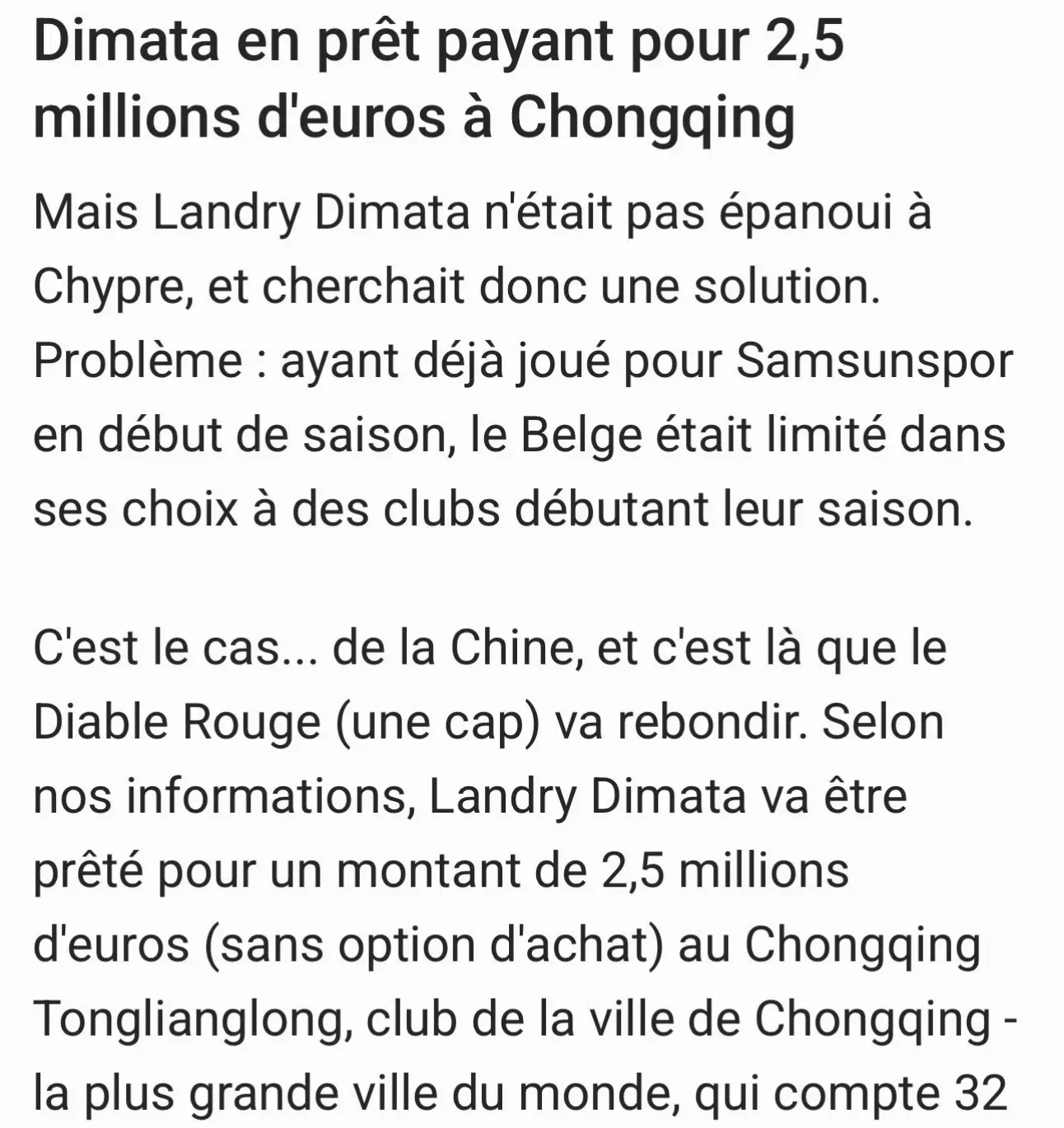 2026年2月4日,据外媒“Walfoot.be”主编Florent Malice报道,欧冠级前锋、比利时国脚迪马塔将以租借的身份加盟中超新军重庆铜梁龙。据了解,迪马塔在塞浦路斯效力得并不顺心,因此一直在寻找新的出路,现在中国球队重庆铜梁龙正好符合这一条件,迪马塔愿意加盟中超联赛。据可靠消息,他将以租借的身份去中超球队,租借费用高达250万欧元,而且并不包含买断条款。