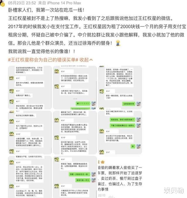 为了让更多普通网友相信,这些爆料人还晒出聊天记录,达到迷惑众人的目的,表示王红权星曾经的房租都要分期付款,还当过群众演员,给徐海乔当过替身。