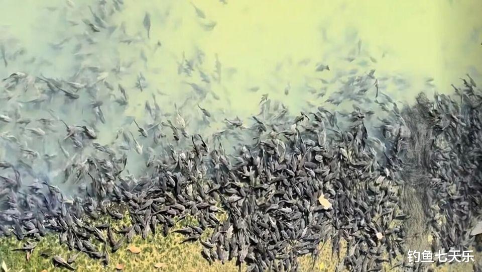 如果再把镜头拉远,从航拍画面向下数一数,一段河道上起码有上万条“清道夫”,浮在水面晒太阳。