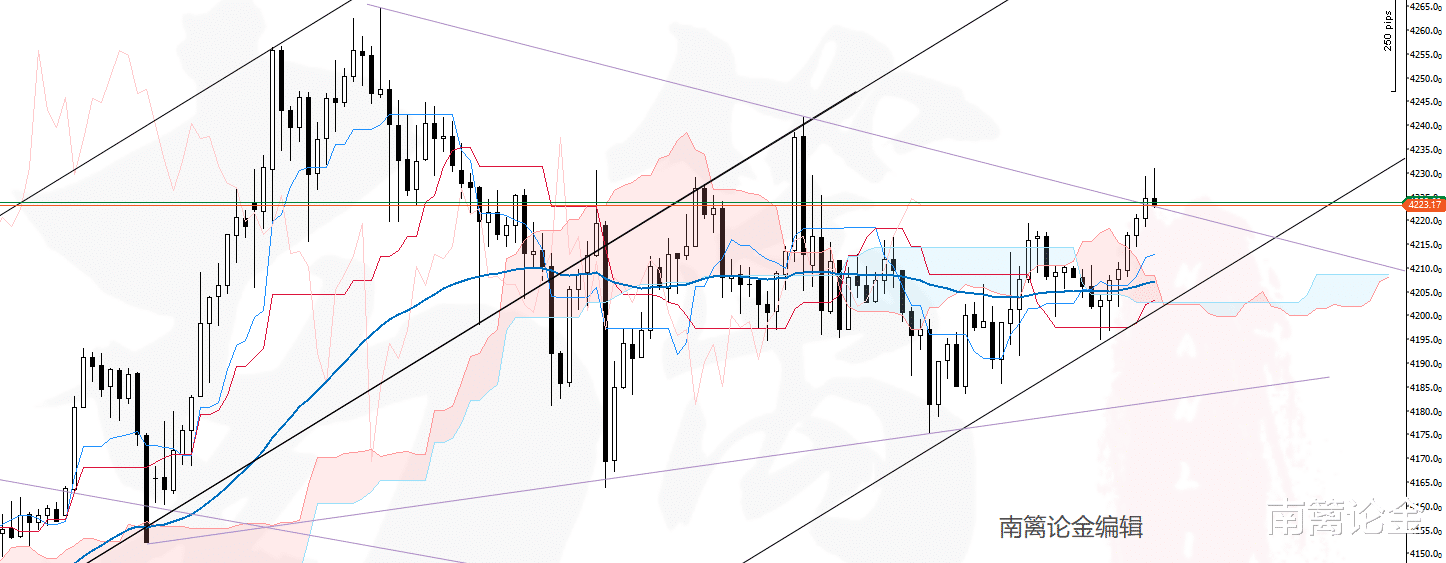 若说行情进一步发力,突破所谓的压制,那么行情进一步上涨力度会更强一些,上方则需要关注一下4250—60区间。而4200将是去作为一段时间内的顶底转换位的存在。日内关键分水岭部分自然是4200一带,同样的,根据三角的结构,下方则关注4180—70区间的支撑。