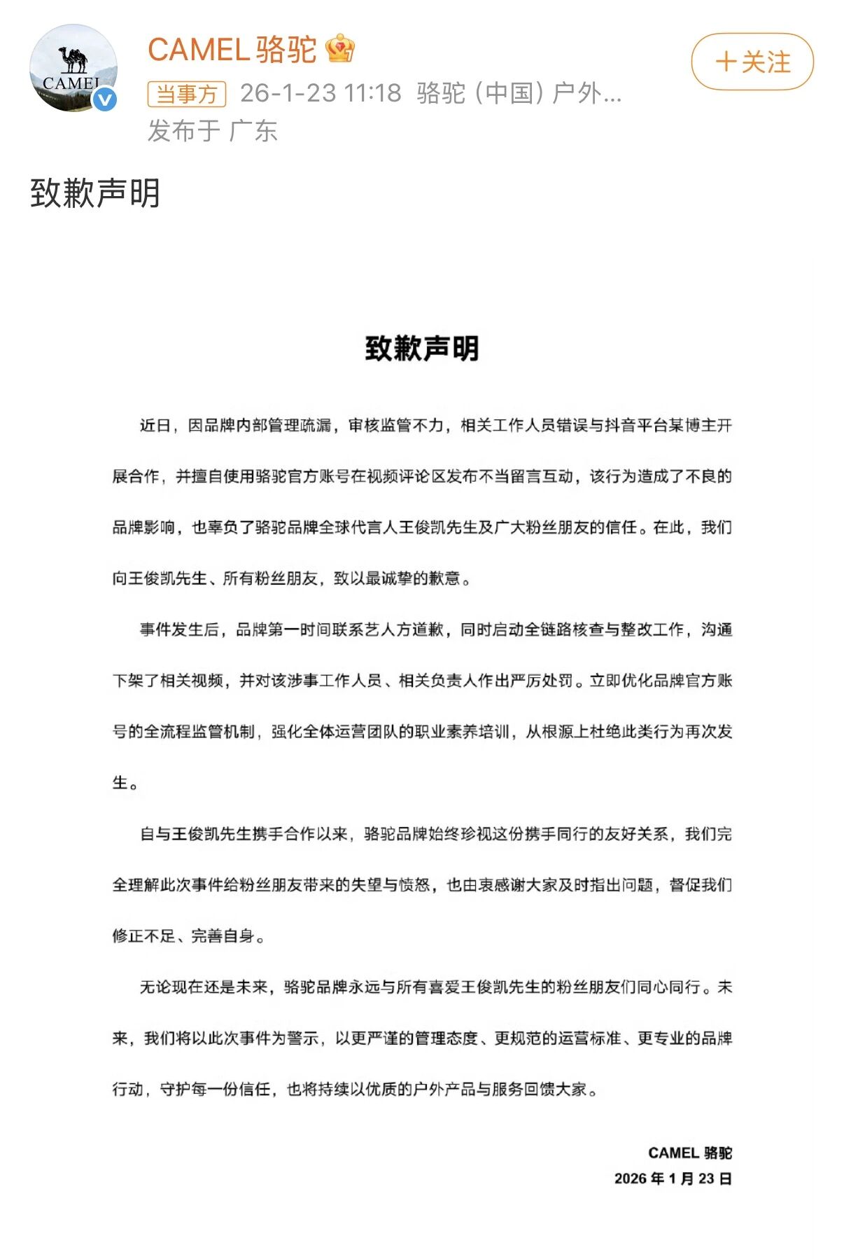 近日,因品牌内部管理疏漏,审核监管不力,相关工作人员错误与抖音平台某博主开展合作,并擅自使用骆驼官方账号在视频评论区发布不当留言互动,该行为造成了不良的品牌影响,也辜负了骆驼品牌全球代言人王俊凯先生及广大粉丝朋友的信任。在此,我们向王俊凯先生、所有粉丝朋友,致以最诚挚的歉意。