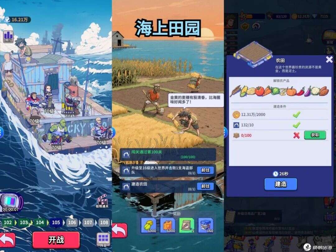 《疯狂水世界》以线性任务为主,在1-16级这个区间,玩家需要做的基本就是捡垃圾-收集资源-盖房-生产资源-完成订单,依靠这些操作来获取经验升级。当然,为了强化玩家的前期留存,《疯狂水世界》也增加了一些阶段性的目标,比如先是出现类《无尽冬日》的生存危机-海上暴风雨,算是新手教程的一个过渡;这次灾难过后,还会随等级解锁探险模式,探险模式解锁初期,会给玩家定下一个通过60关的小目标,这一系统核心目的是战力PK以及凸显英雄培养玩法;在14级,则会进一步解锁建造农田任务,完成该任务需要满足三个条件,其中一个就是升到16级并且进入世界击败一支海盗部队,所以也可以说,该任务是从模拟经营过渡到SLG和社交玩法的一个重要事件。