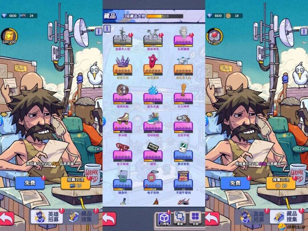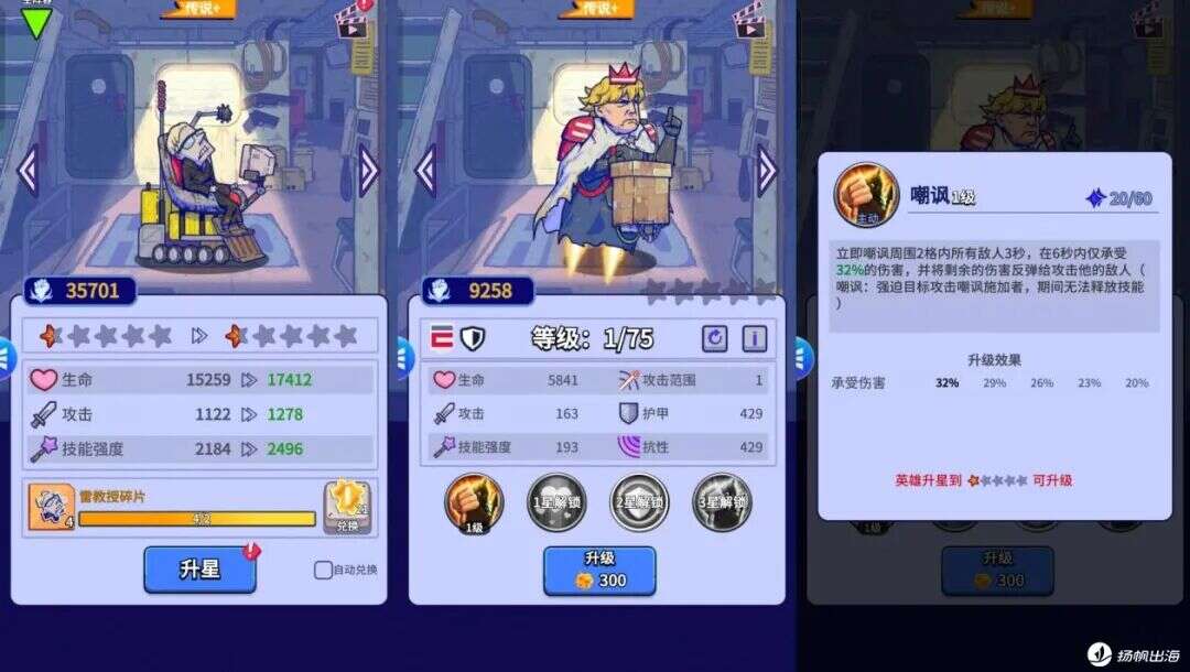 综合而言,《疯狂水世界》从游戏开局捡垃圾,到系统解锁和玩法过渡方面,每个环节都环环相扣,特别是在模拟经营相关的小游戏和设计上,整个体验感受都非常流畅自然,背后可见益世界在休闲模拟经营领域长期积攒的成熟经验复用。另外,其独特的卡通画风也为游戏增色不少,其中不少角色还借鉴了现实中话题人物形象玩梗,比如川普、霍金等等(川普在游戏中叫大嘴山姆,技能是嘲讽),进一步增强了游戏的休闲属性。而且从这一角度预测,接下来《疯狂水世界》或许也将会登陆海外市场。