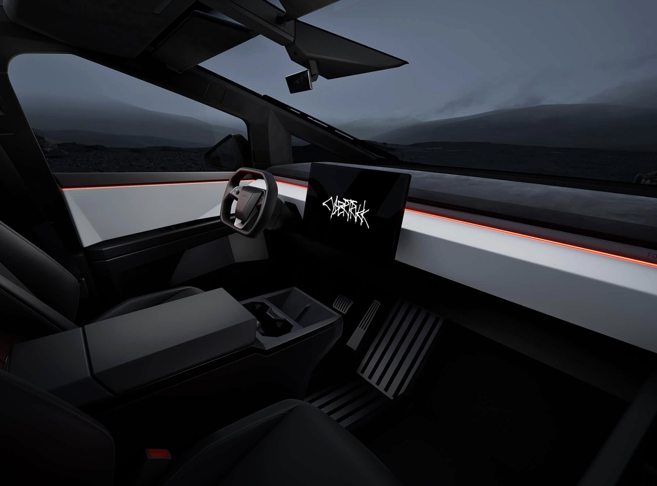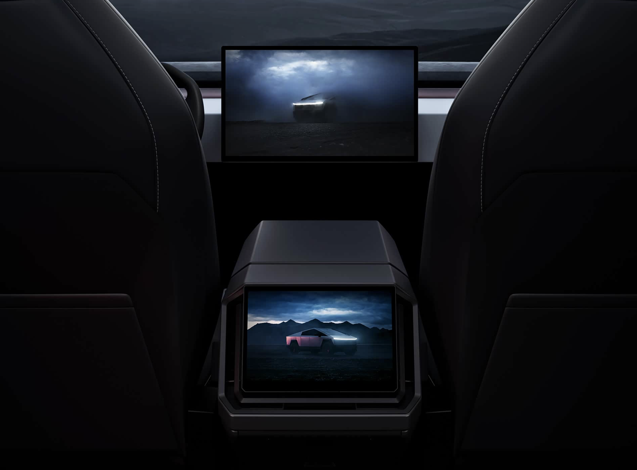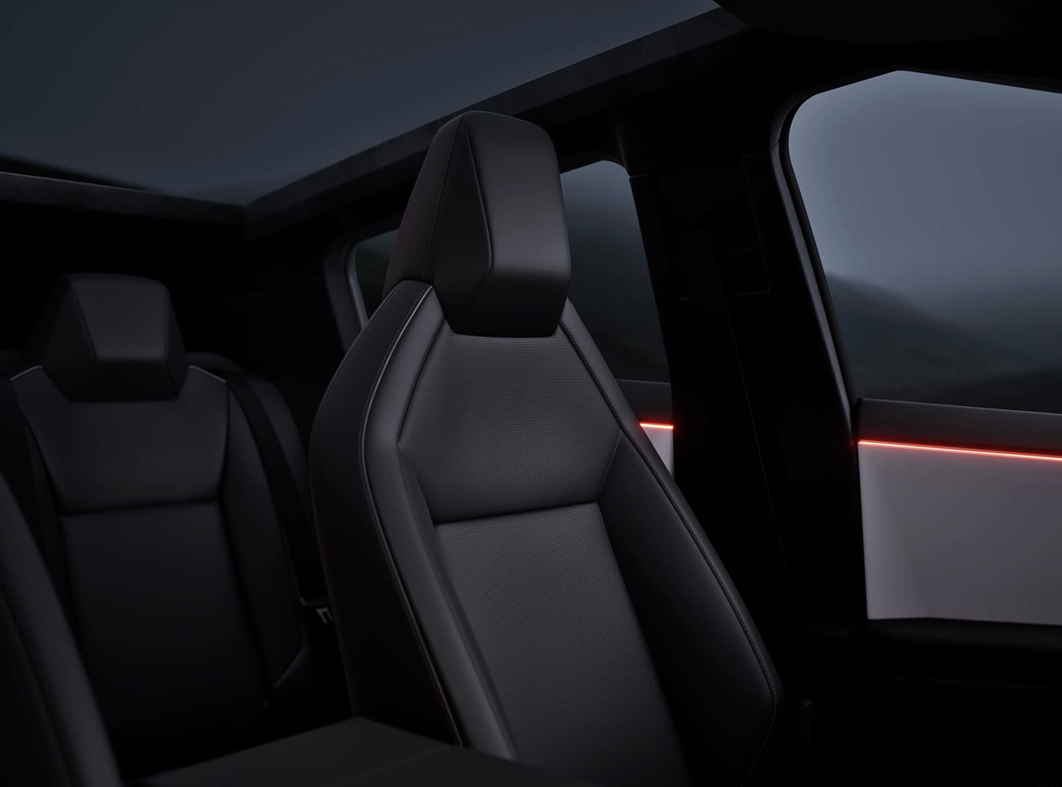 进入车内,特斯拉Cybertruck也更加简约,环抱式的座舱采用了大面积浅灰色皮面铺陈,配备了织物+真皮拼接的灰色座椅,一体式的设计更加结实耐用,也带来了更好的包裹性和支撑性。车顶配备了大尺寸全景天幕,配合着四周的侧窗、前风挡玻璃、尾窗,带来了更充足的采光。中控台配备了改进版的多边形“Yoke”方向盘,多功能按键布局简洁,车标替换为Cybertruck专属标识。科技感方面该车配备了18.5英寸的中控液晶大屏,为后排乘客提供了9.4英寸的触控液晶屏,还配备了15扬声器(包含2个专用低音炮)的高级音响,可用于调节空调、观看视频等,提升后排乘坐体验。