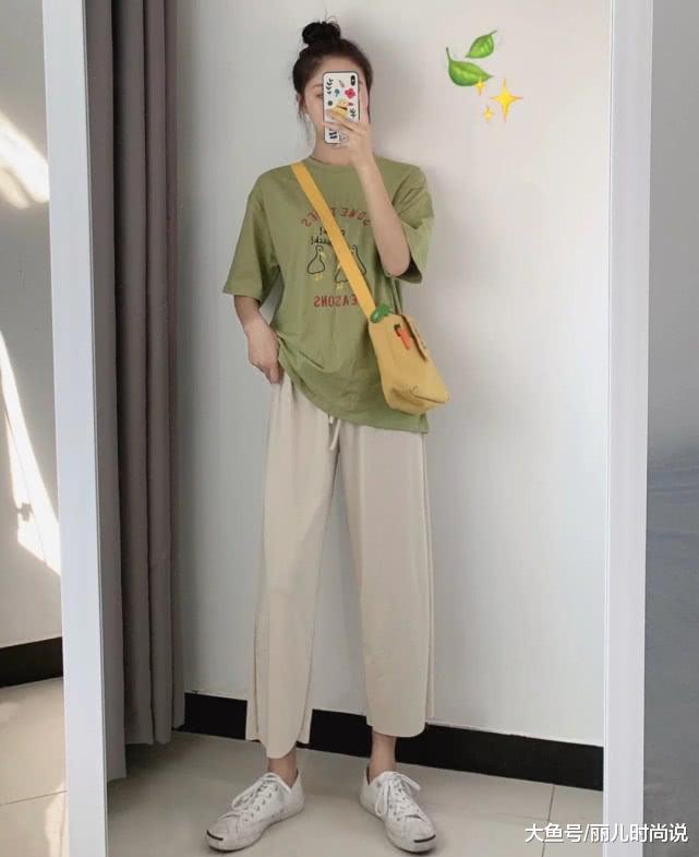 草绿色短袖t+米色阔腿裤,这么一套搭配,让我忽热就闻到了淡淡的青草香味,在夏季,这样的穿搭是十分清爽的,重点是很舒适休闲,日常里喜欢穿得随意一些的都可以借鉴下这么穿,真的很不错呢!