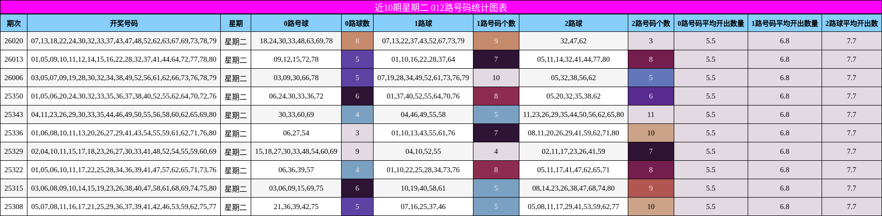 下图展示了近10期星期二012路号码的分布情况。可以看出,2路号码在多数期次中占据主导,而0路号码在第26019期、26023期等节点出现过集中补涨,说明其具备“间歇性爆发”特征。本期若延续2路热度,0路或在低位形成“反扑”,形成7:6:7的均衡格局,值得留意。
