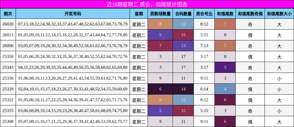 从近10期星期二的质合数据来看,合数号码累计开出137个,质数仅63个,合数占比高达68.5%,明显处于强势状态。上期质合比为4:16,合数延续了高开态势,而质数则连续多期低迷,出现明显冷态。这种失衡状态在历史走势中并不罕见,但持续性过强往往意味着反弹压力加大。