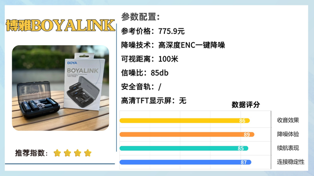 纽扣机身,极致迷你,AI降噪,续航偏短。博雅BOYALINK发射器如纽扣大小,重量仅5g,可贴肤佩戴,完全隐藏,适配各类穿搭出镜。搭载微型高灵敏咪头,支持48kHz/16bit采样,人声清晰,基础AI降噪可过滤室内底噪和户外轻微杂音,精准识别人声。2.4GHz迷你无线传输,无遮挡80米,抗干扰性适中,开机自动配对,接收器即插即用,兼容手机、相机。单发射器续航5小时,充电盒补能后总续航15小时,支持快充,便携性拉满。短板是续航偏短,不适合长时拍摄,强噪音环境降噪效果有限,无内置存储,仅支持单发一收,机身易丢失。适合颜值博主、轻量创作者,用于美妆Vlog、日常随拍、短时长直播等。