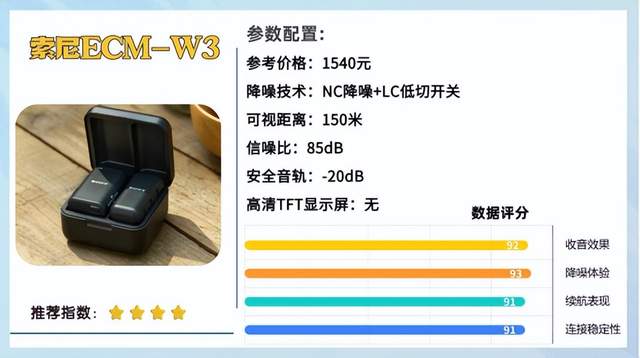 升级款旗舰,蓝牙5.3,150米传输,安全音轨。发射器同ECM-W3S轻量化设计,17g佩戴无感,防尘防潮,户外拍摄适配性强。高信噪比全向咪头,48kHz/24bit数字传输,NC数字降噪+LC低切双重功能,过滤杂音和风噪,新增安全音轨避免爆音。蓝牙5.3+LC3+编码,无遮挡150米传输,抗干扰性强劲,双声道分离清晰,细节捕捉到位。索尼热靴直连,相机辅助供电续航18小时,支持手机、电脑多设备兼容。不足是价格昂贵,生态适配性强,非索尼设备操作繁琐,无内置存储,仅支持一拖二。适合专业影视团队、索尼生态用户,用于商业拍摄、户外创作、多人访谈等。