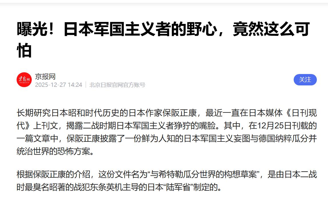 尘封多年的野心12月25日,日本历史学家保阪正康公开了一份被日本所忽视的资料,该资料是有关日本军国主义在二战时期的一个计划。