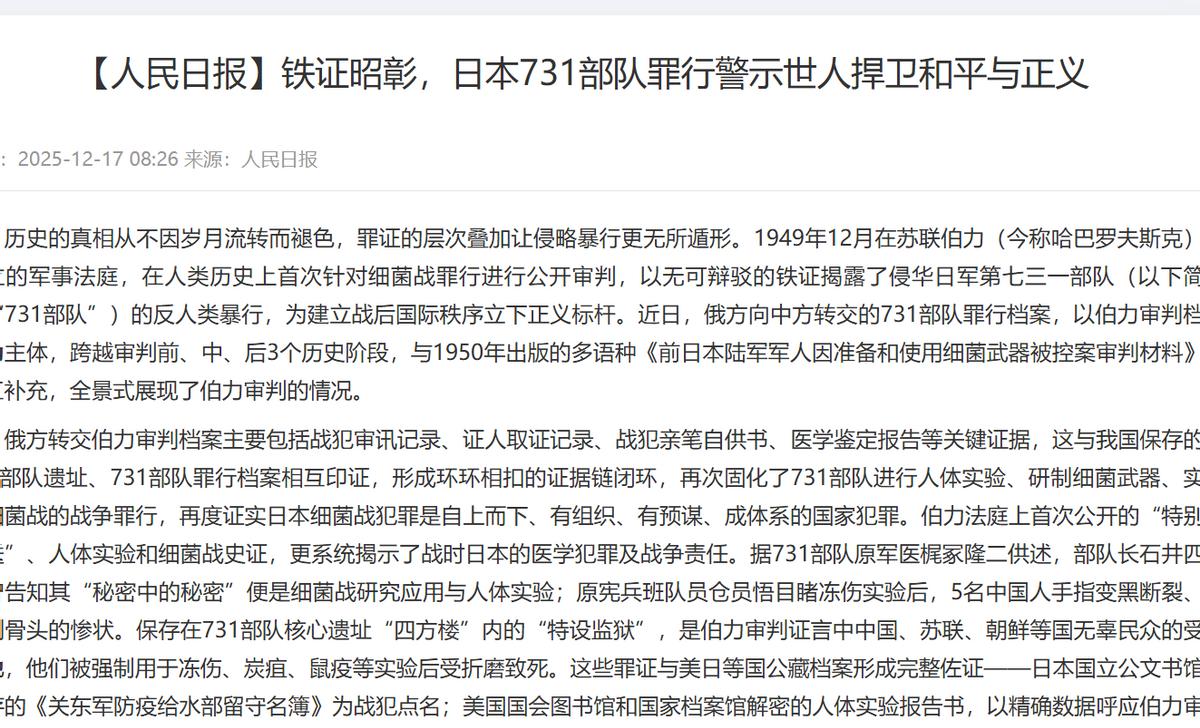 [人民日报】铁证昭彰,日本731部队罪行警示世人捍卫和平与正义2025-12-27