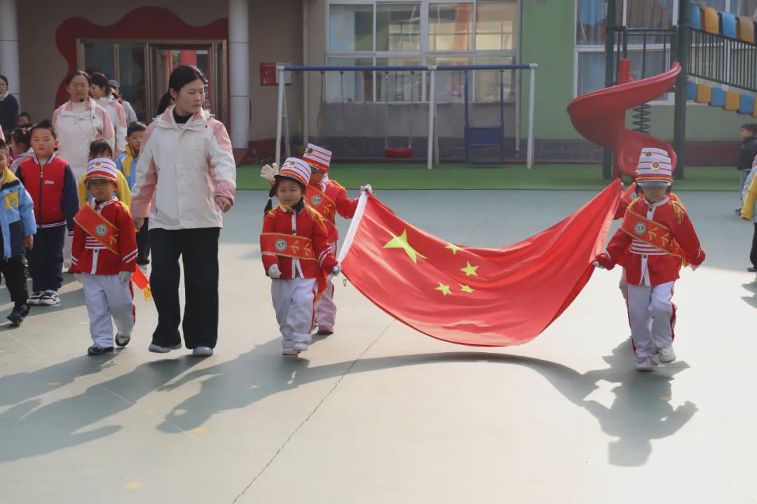当日上午,阳光明媚,升旗仪式在幼儿园操场正式拉开帷幕。中三班的小小旗手们身着整齐服装,迈着坚定有力的步伐,目光炯炯、神情庄重地护送国旗入场。挺拔的身姿彰显着蓬勃朝气,昂扬的状态饱含对国旗的崇高敬意,充分展现了新时代幼儿积极向上的精神风貌。随着雄壮的国歌奏响,全体师生立正站好,面向国旗行注目礼、齐唱国歌,稚嫩的歌声中满含对祖国的热爱与自豪。