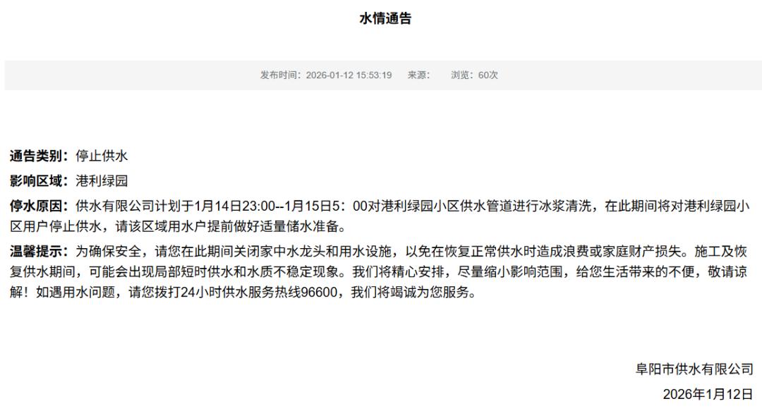停水原因:供水有限公司计划于1月14日23:00--1月15日5:00对港利绿园小区供水管道进行冰浆清洗,在此期间将对港利绿园小区用户停止供水,请该区域用水户提前做好适量储水准备。