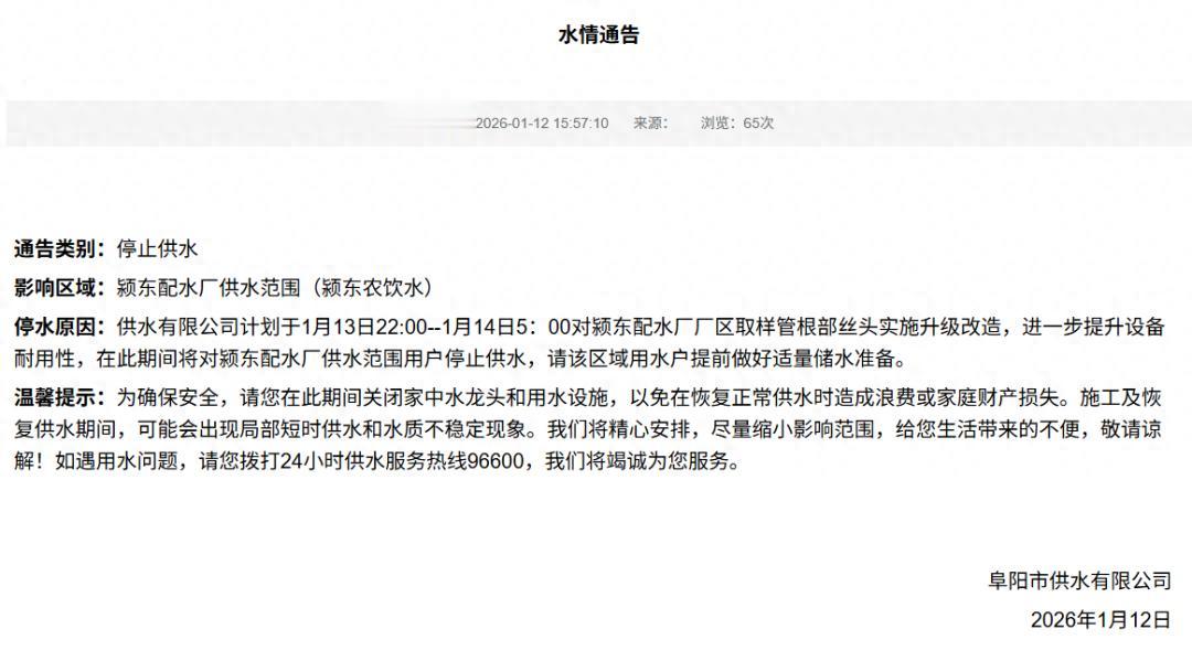 停水原因:供水有限公司计划于1月13日22:00--1月14日5:00对颍东配水厂厂区取样管根部丝头实施升级改造,进一步提升设备耐用性,在此期间将对颍东配水厂供水范围用户停止供水,请该区域用水户提前做好适量储水准备。