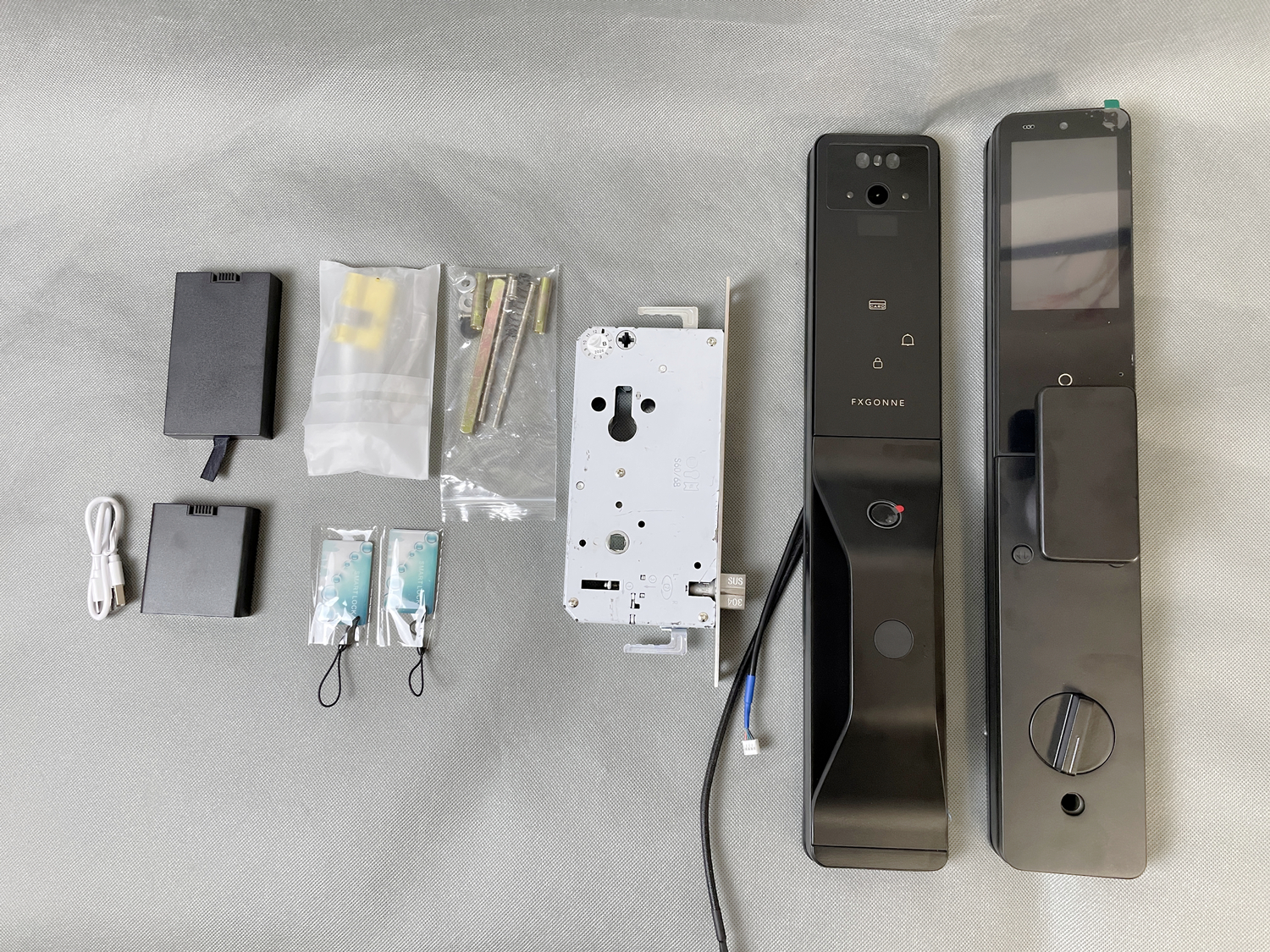 打开包装可以看到配件如下:室外面板、室内面板、C级锁芯、锁体、 电池、各型号螺丝一包、机械应急钥匙2把、NFC门卡2张、Type-C充电线、安装说明书、保修卡等配件。