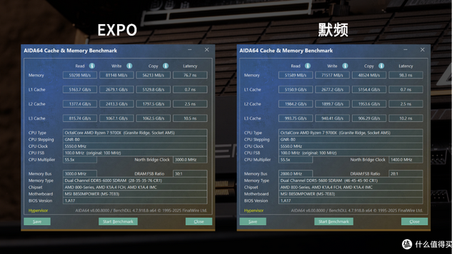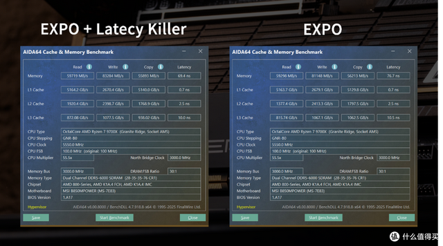 两家联盟如果只开个EXPO肯定是不够的,B850 MPOWER还提供了Latency Killer和High-Efficiency Mode两项内存优化设置。在叠加了Latency Killer优化后,对比仅开启EXPO时,延迟再次下降了7.4ns。