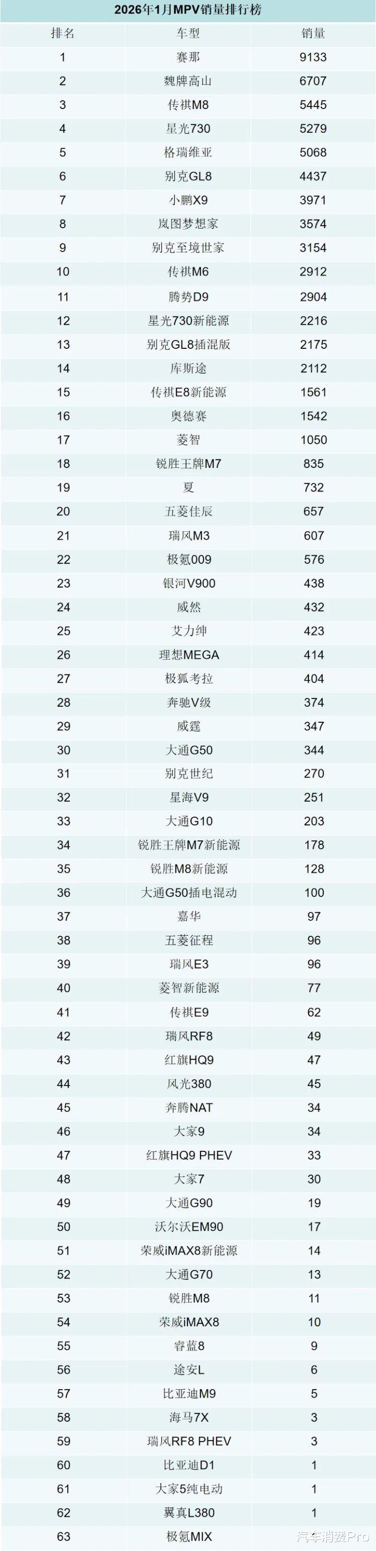 1月份比较特殊,是新能源开始征收购置税的首个完整月,叠加春节临近,整个市场销量比较低迷,且各细分市场格局也有着明显的变化。就拿MPV市场来看,蓝牌的赛那以9133台的月销成绩拿下1月销量冠军,而此前一些热门且销量靠前的绿牌中大型MPV都受到相当大的影响。