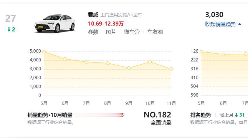 就拿10月份的销量报表,别克旗下只有昂科威的销量过万,曾经备受大家欢迎的君威、君越、GL8、威朗等车型的销量都一跌再跌,尤其是君威,曾经月销轻松1万+辆,如今,在10月份的销量只有3841台。11月份也仅仅卖出3030台。