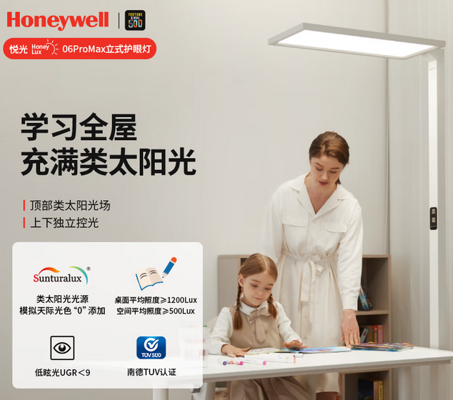 霍尼韦尔06ProMax的桌面平均照度能达到1415lux,这可比国AA级水平高出两倍还多,在这样的光照下阅读、工作,很清晰。